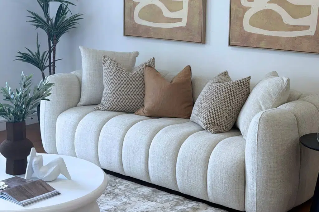 - Mix and match textures (linen, boucle, woven) for a designer look