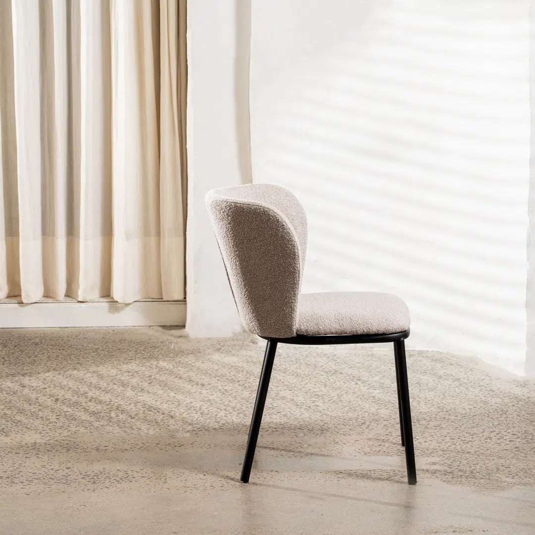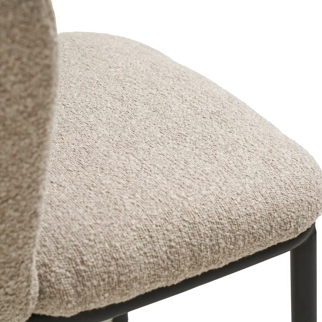 The boucle fabric upholstery offers a soft, tactile surface resistant to everyday wear, while the black powder-coated metal frame provides lasting stability in high-traffic areas. Designed to withstand frequent use without compromising elegance, these chairs maintain their polished appearance in homes, cafes, or commercial dining environments.