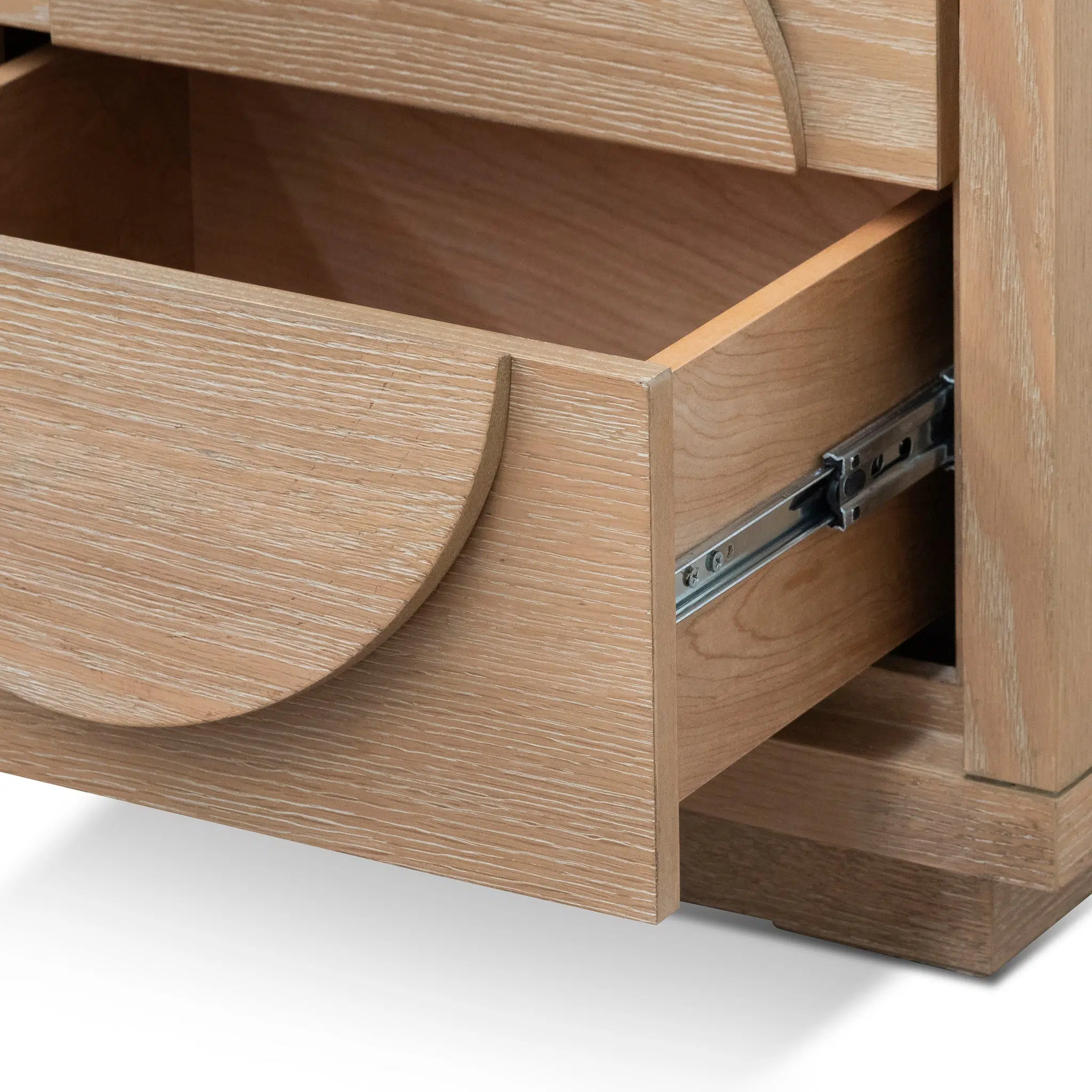 Equipped with smooth metal drawer runners for effortless opening and semi-circular handles that double as subtle design accents, this table prioritizes both form and function. The raised base elevates the structure, enhancing visual lightness and providing easy cleaning access beneath.