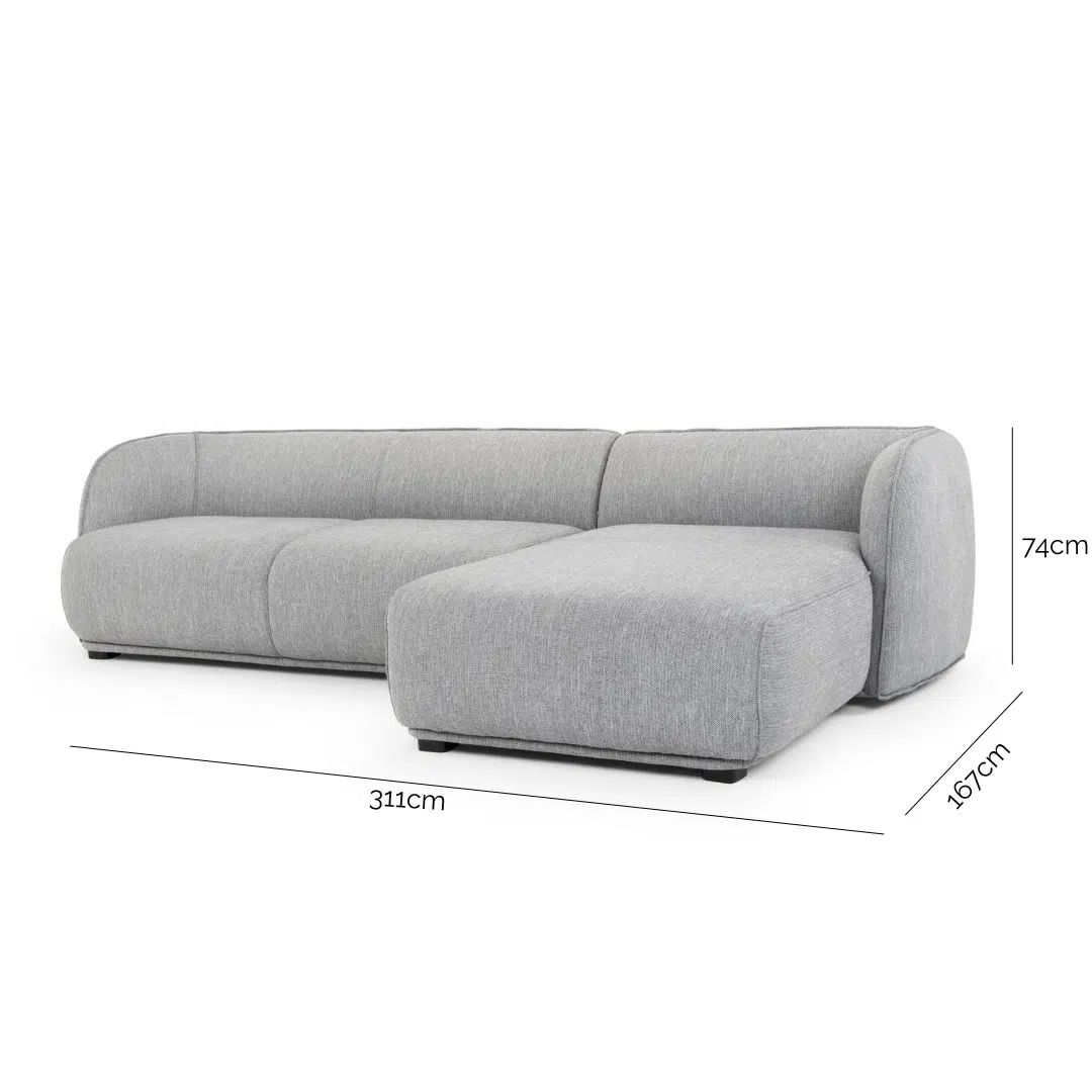 This sofa features a generous 311cm width and a depth that extends from 99cm to 167cm, offering ample room to stretch out or curl up. The right-side chaise measures 110cm (W) x 134cm (D), creating the perfect spot for reclining. With a seat depth of 66cm and seat height of 46cm, comfort is built right in, complemented by high-density foam cushioning that supports your body for hours of lounging.