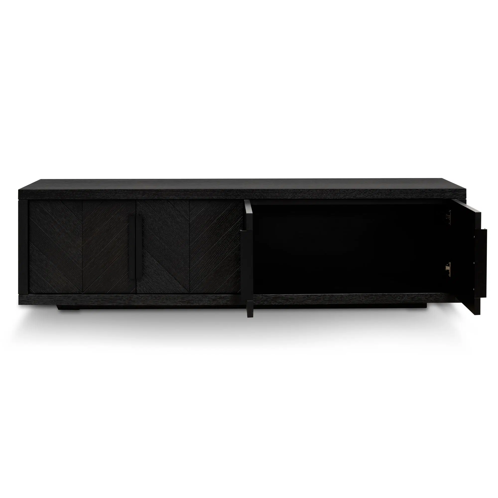 Four spacious cupboard doors conceal two internal compartments, creating seamless organization for media accessories, game controllers, and household essentials. Matte black metal handles add modern industrial accents while providing secure, easy access. The integrated appliance hole at the back allows hassle-free cable management for a clutter-free entertainment zone.