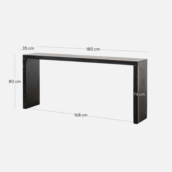 Designed for modern living spaces, the 180cm length offers generous storage and display capacity while maintaining a sleek 35cm depth that fits narrow hallways. The 80cm height allows effortless placement beneath wall art or mirrors, with 74cm clearance beneath the base for easy cleaning. The 168cm leg spacing ensures stability while maintaining walkway accessibility in high-traffic areas.