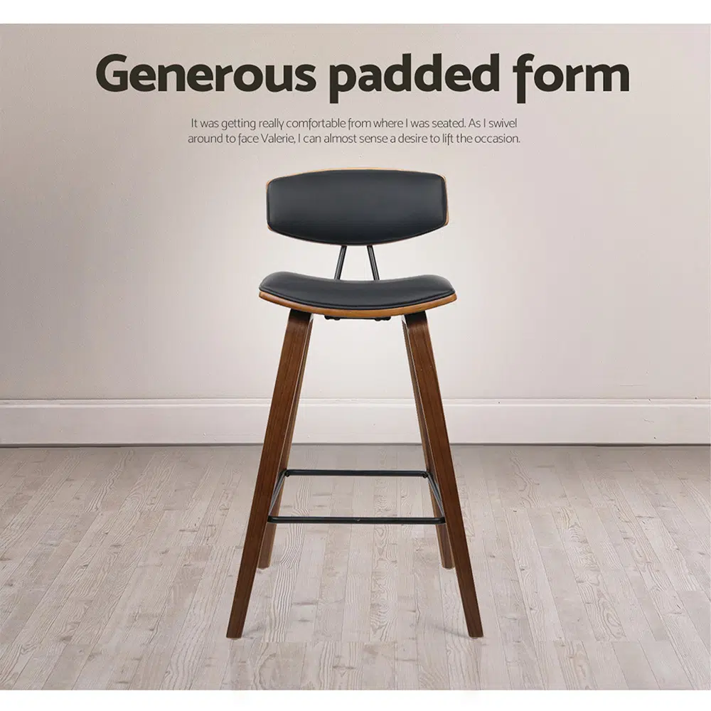 Built with a solid wood frame in a rich walnut finish, the stool delivers natural warmth and long-lasting strength. The wide curved backrest and smooth PU leather seat provide supportive, comfortable seating while maintaining a sleek, contemporary look.