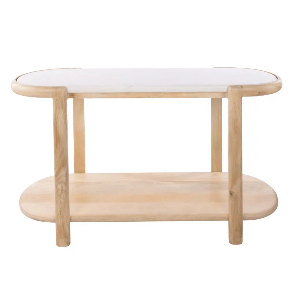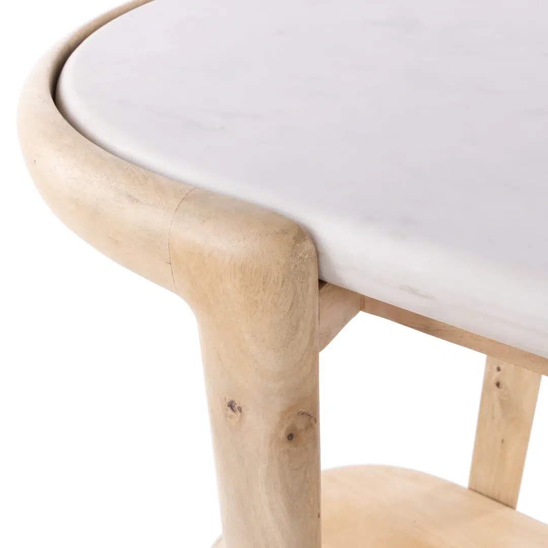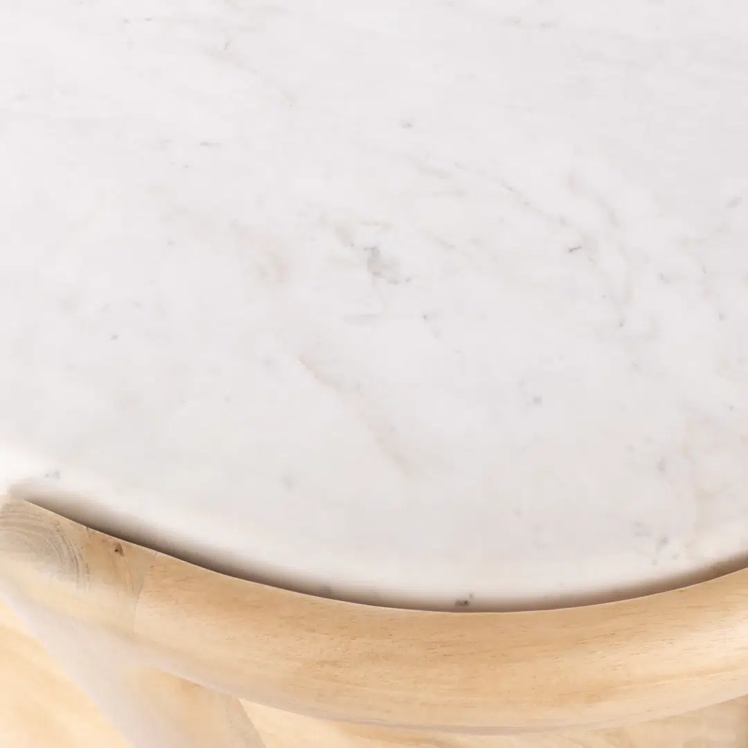 The combination of natural mango wood and crisp white marble creates a harmonious contrast that feels both contemporary and enduring. Its neutral white and natural wood tones integrate effortlessly with a wide range of décor styles, from minimalist to eclectic.