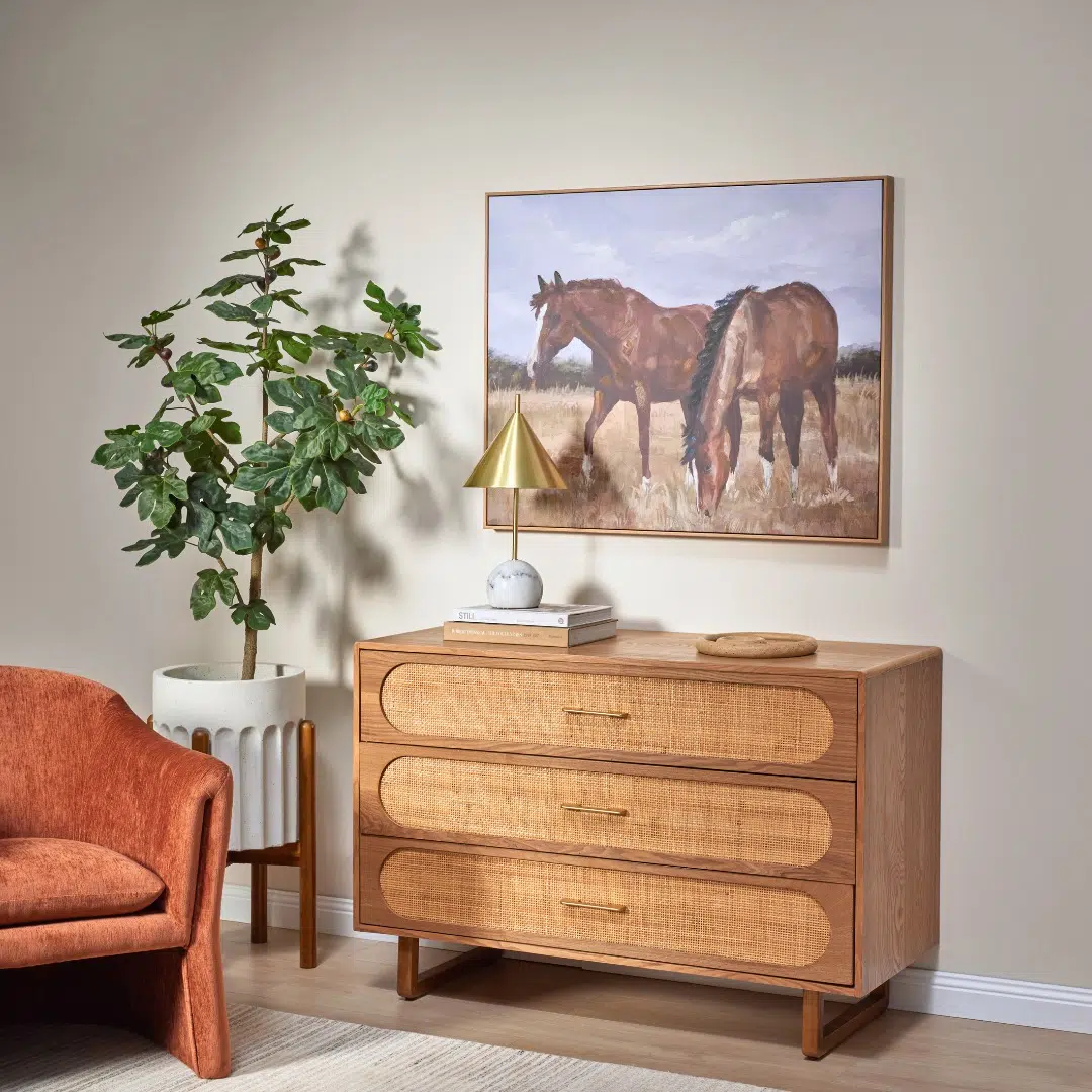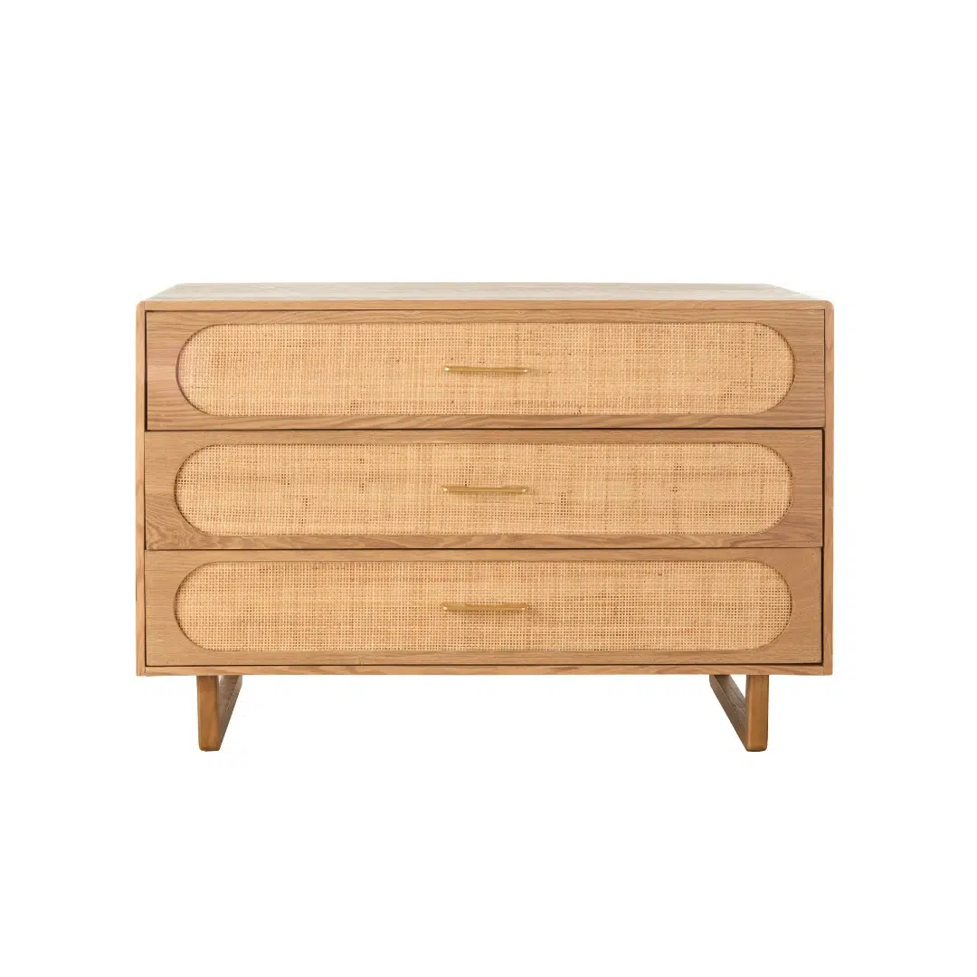 The Aspen showcases a softly rounded rectangular silhouette paired with three spacious drawers, each fronted in woven rattan. This combination of solid craftsmanship and organic detailing creates a design that feels both grounded and graceful.