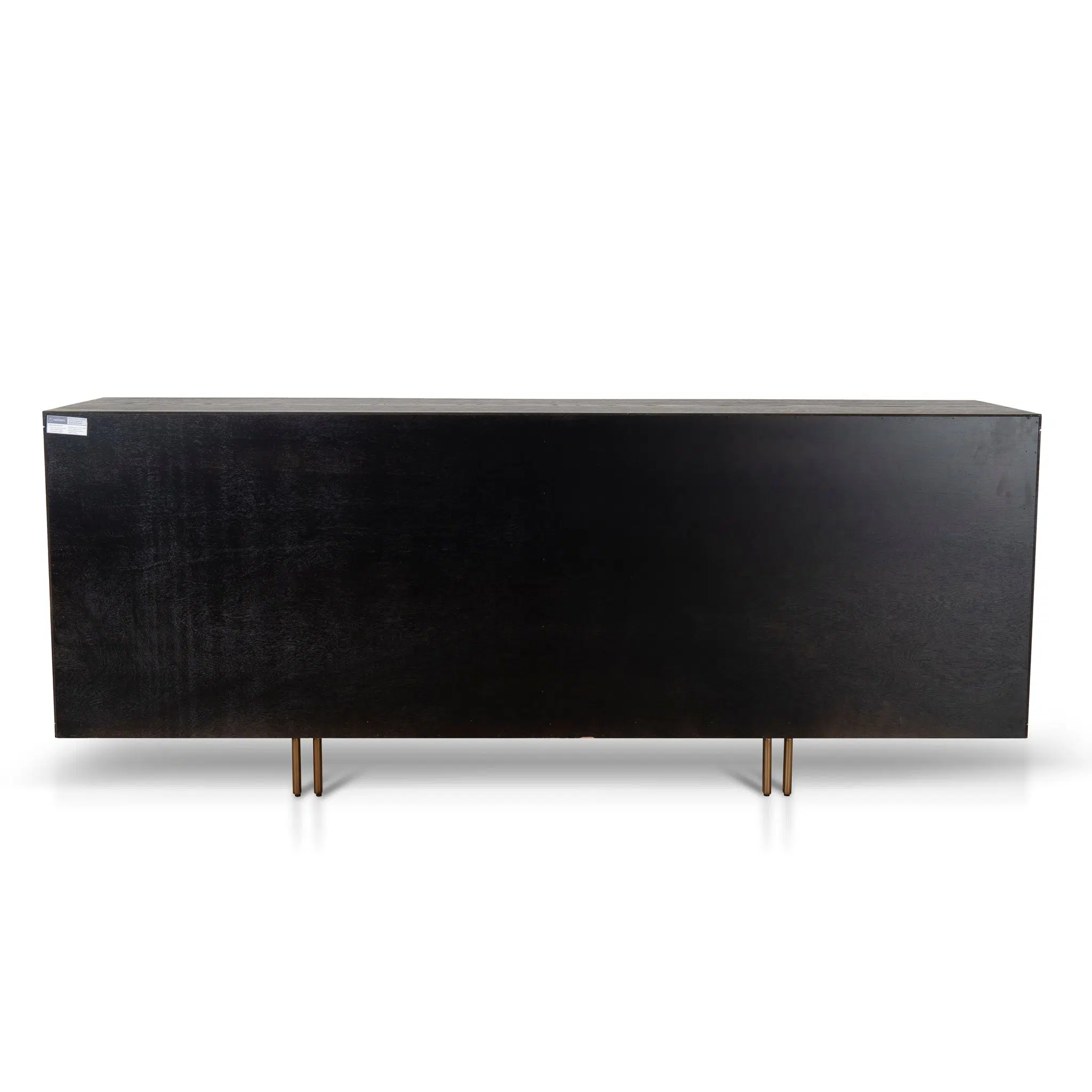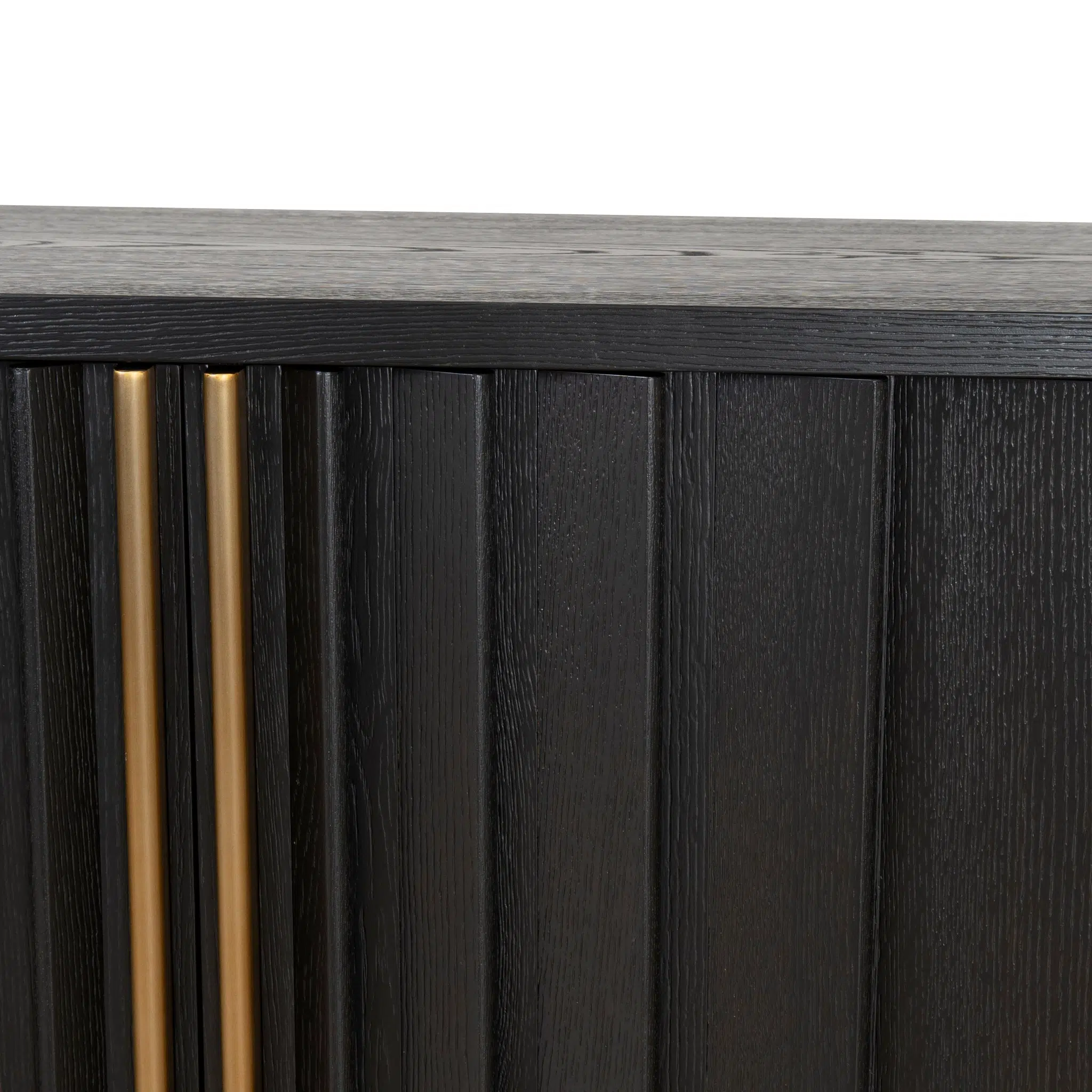 This 2-meter buffet unit combines sleek aesthetics with practical utility to elevate your living space. Its clean lines and minimalist silhouette create a sense of refined order, serving as a stylish focal point in dining rooms or living areas. The textured espresso black finish with NC lacquer coating adds a modern touch, while bronze metal accents on the door handles and legs contribute to a cohesive decorative statement.
