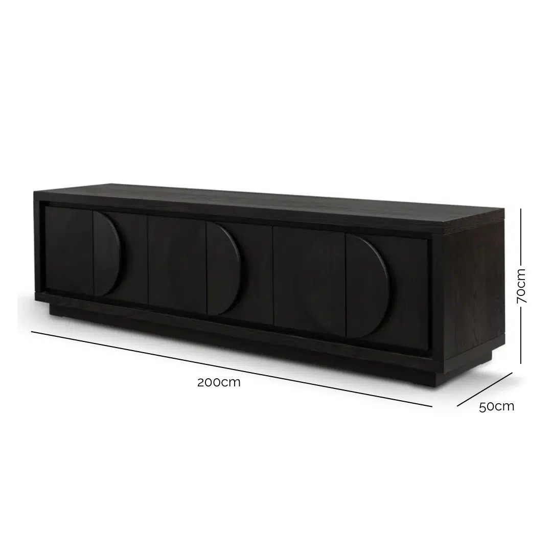 This 2m entertainment TV unit combines sleek monochrome aesthetics with practical design, featuring a rich textured espresso black finish and curved half-moon doors. The powder-black wood grain surface creates a striking focal point in any lounge, blending moody sophistication with minimalist elegance to complement contemporary interiors.
