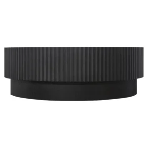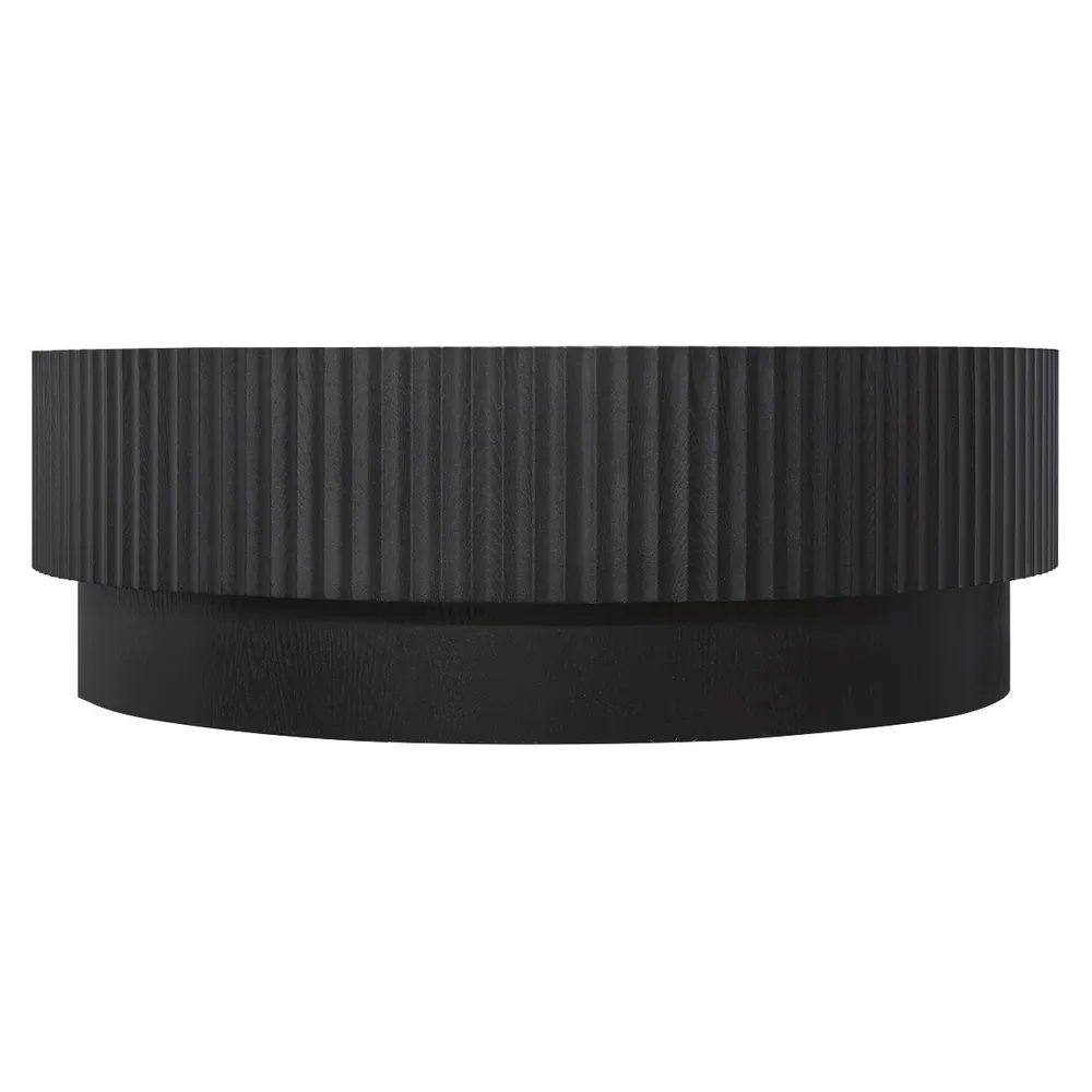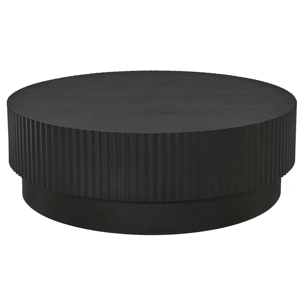 The Avery Round Coffee Table in Black commands attention with its bold, fluted cylindrical base that adds rich texture and architectural depth to any room. Its sculptural form blends seamlessly into contemporary interiors, serving as a dramatic focal point that elevates the overall aesthetic.