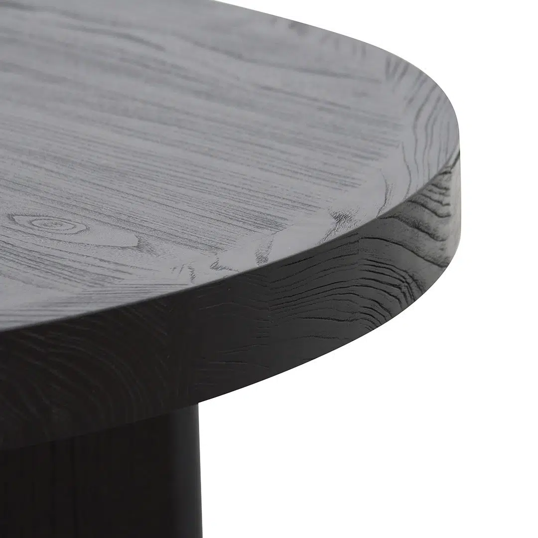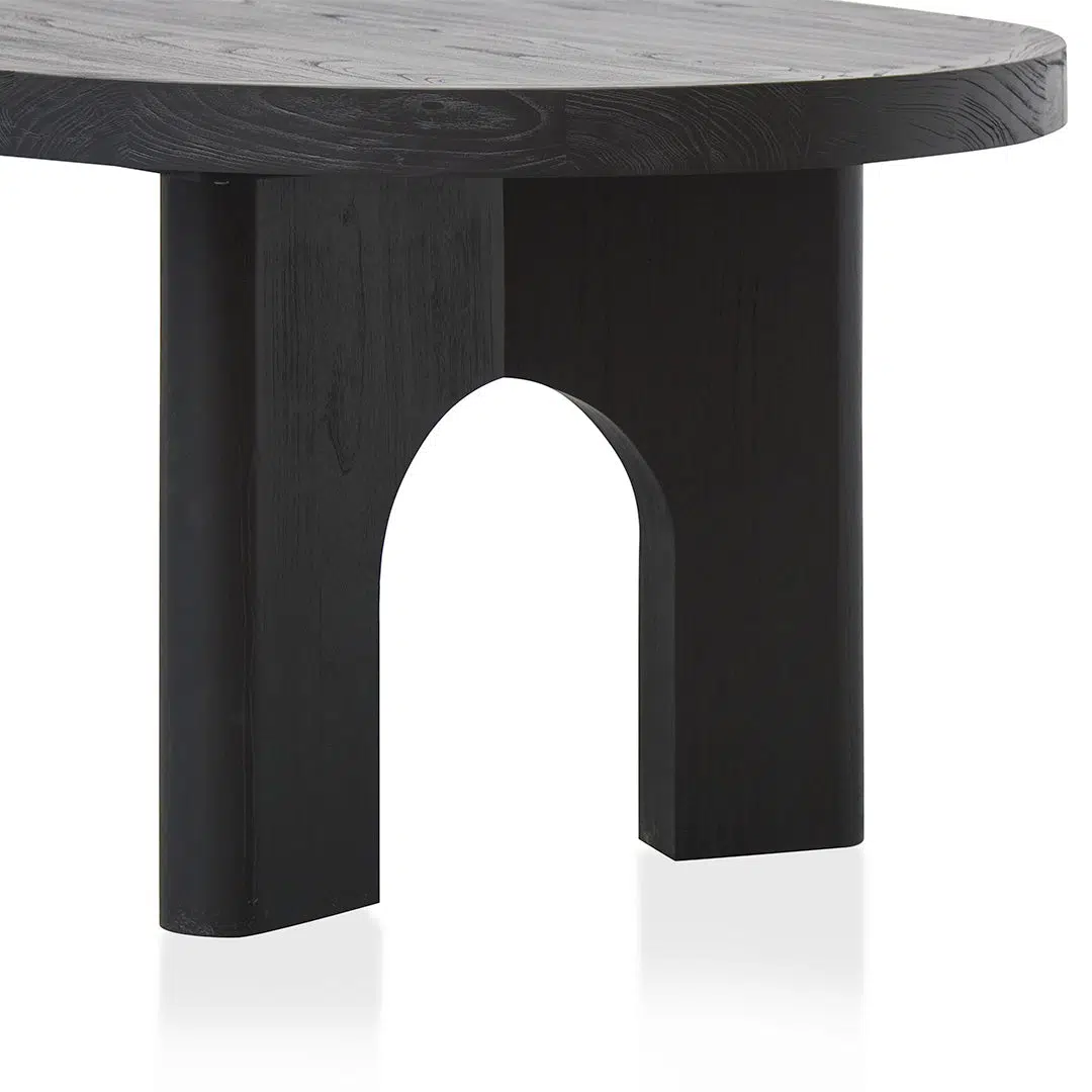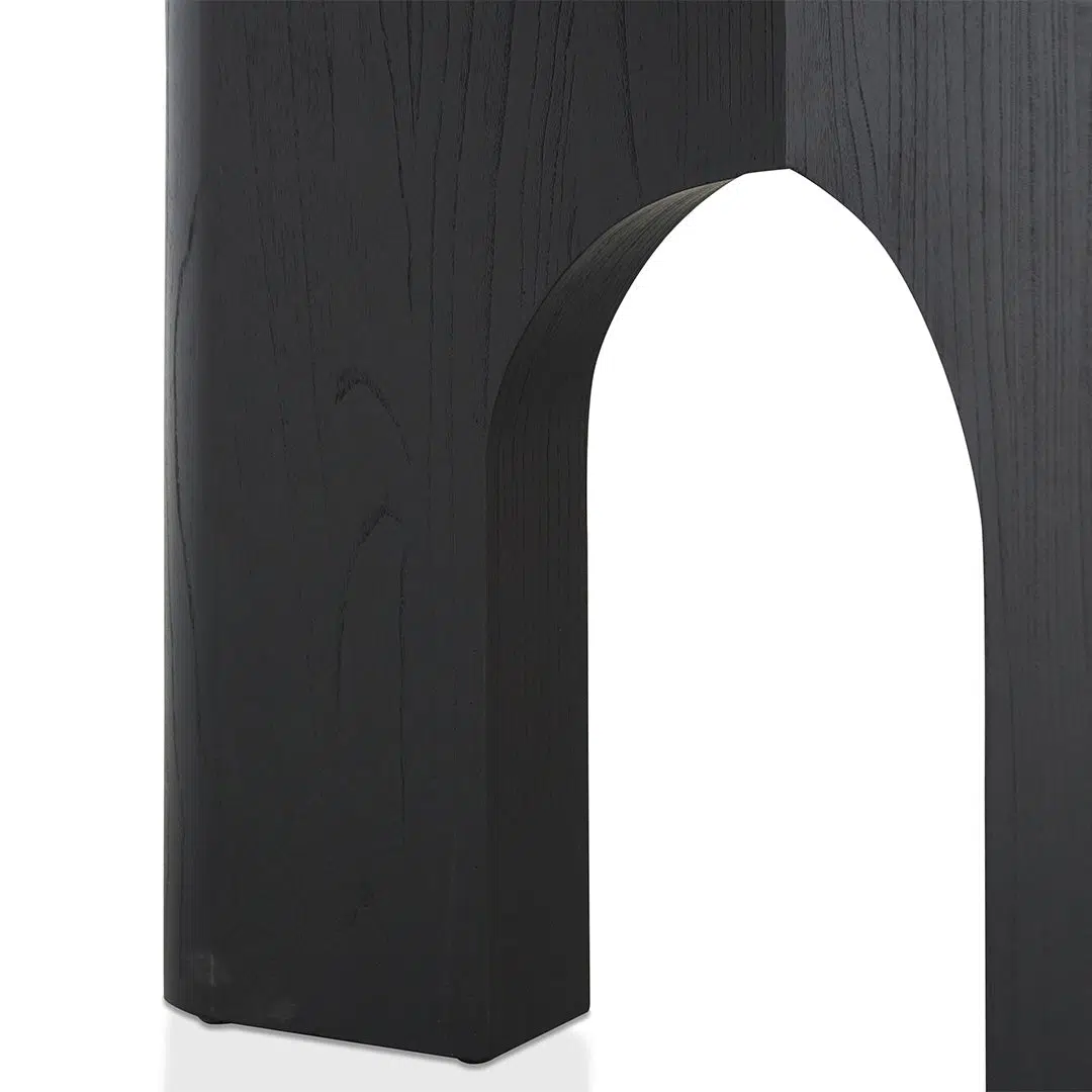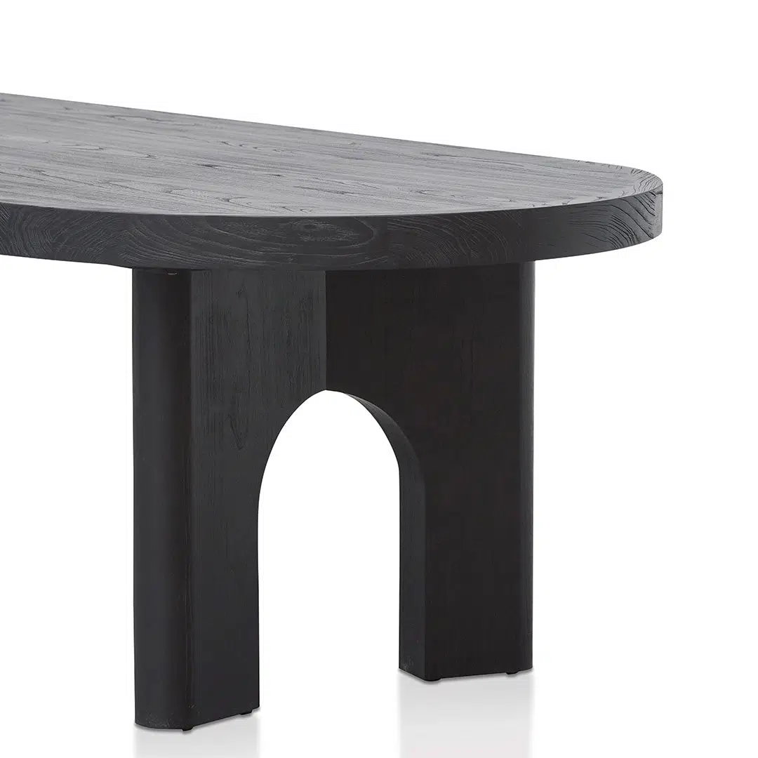 Crafted from solid elm wood and high-quality veneer, the tabletop showcases visible natural grain patterns that add depth and character. Arched panel legs in a deep matte black tone balance the organic texture of the wood with sharp, minimalist lines. Rounded edges and smooth transitions enhance the table’s ergonomic appeal.