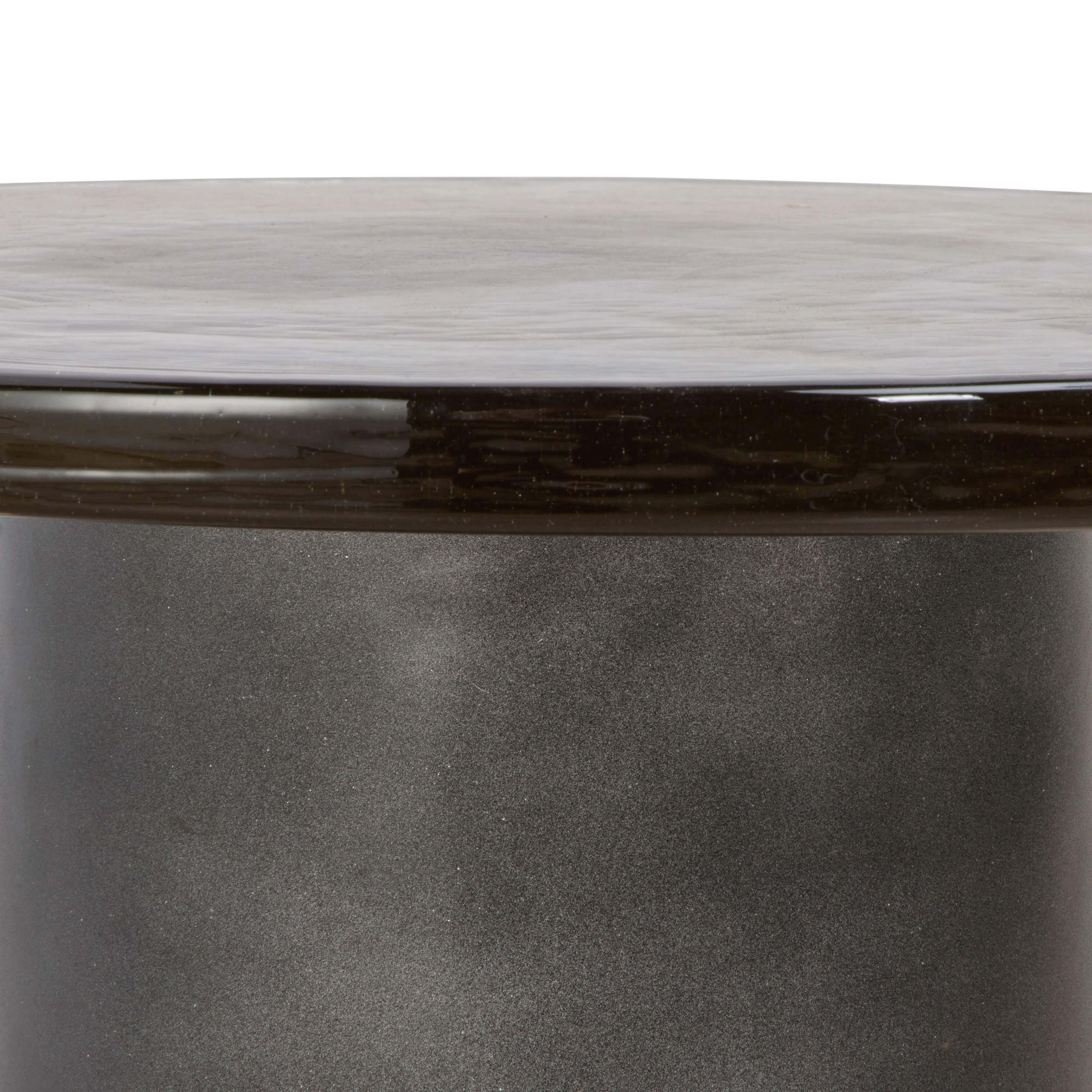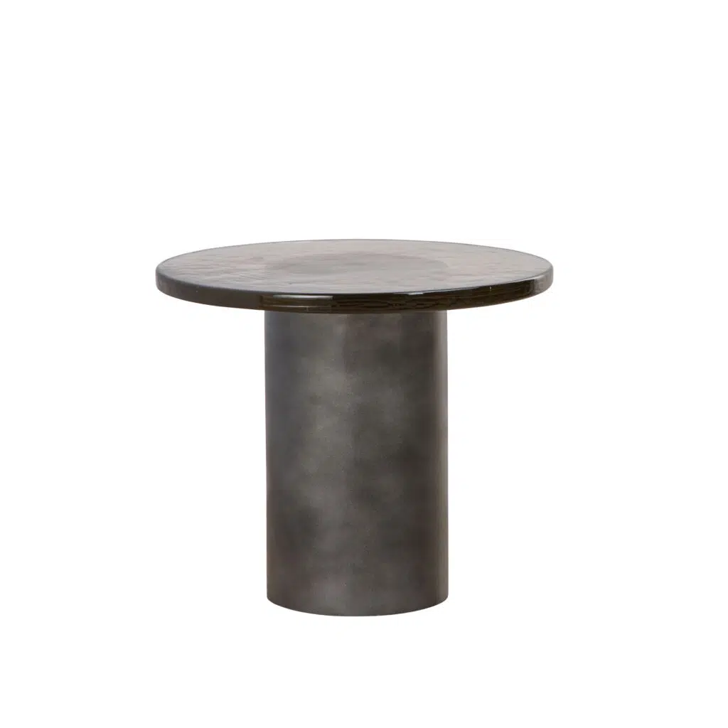 This side table combines a brushed black metal base with a round glass top, creating a bold industrial look that adds depth and character to any space.