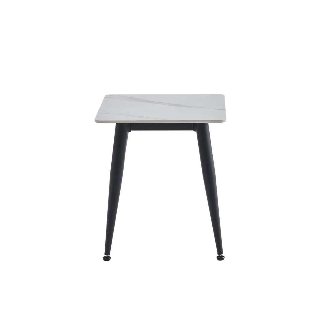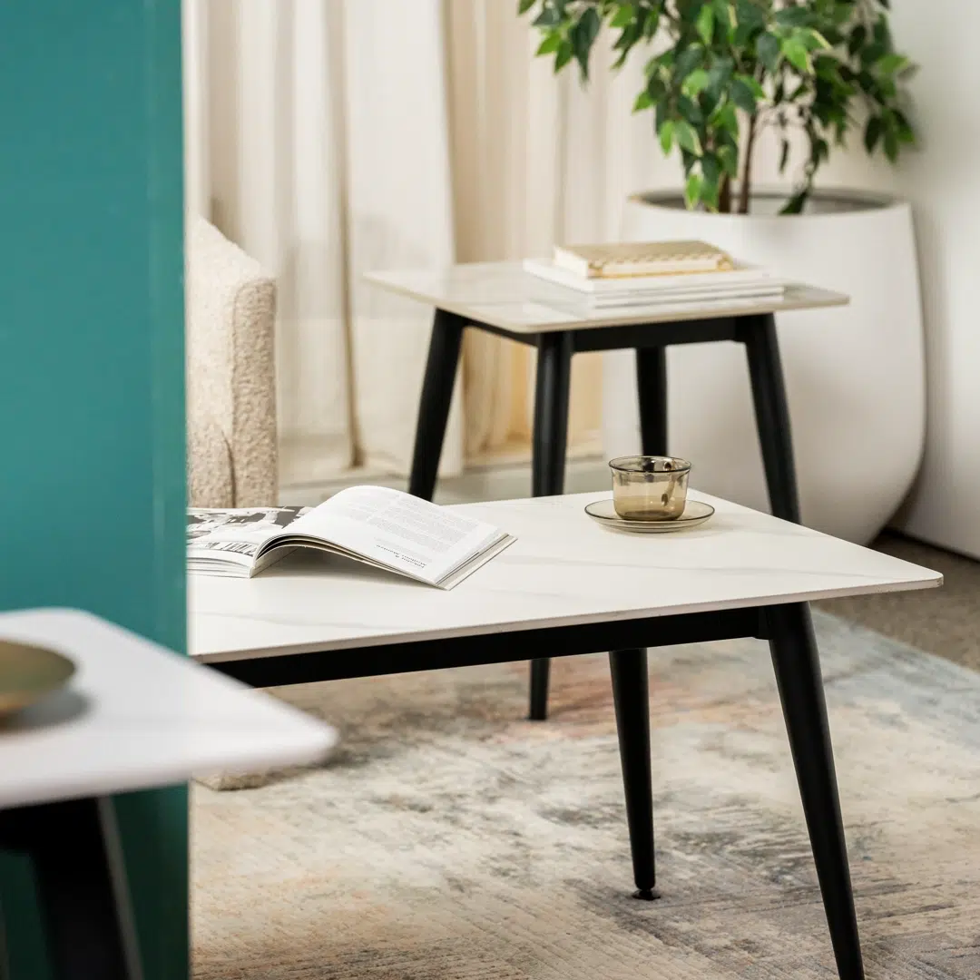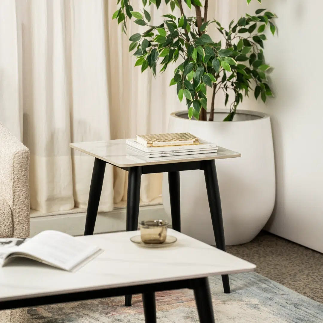 This compact side table blends minimalist Scandinavian influences with contemporary industrial aesthetics, featuring a smooth matte ceramic top with a subtle marble-effect finish. The contrasting black powder-coated metal legs provide striking visual balance while ensuring durability in high-traffic areas.