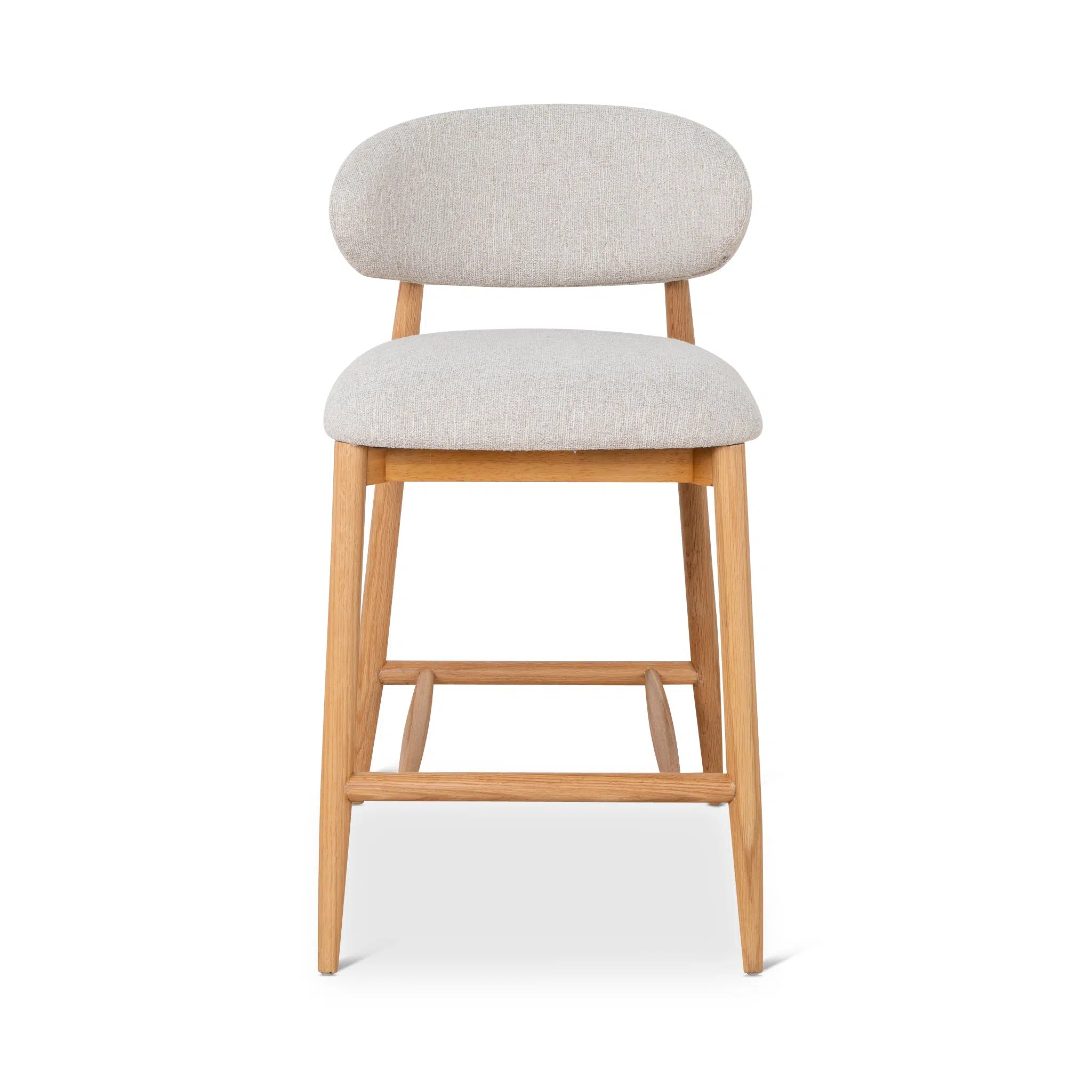 The integrated wooden footrest adds an extra layer of comfort, encouraging relaxed postures during meals or conversations. The soft beige fabric resists stains while maintaining a warm, inviting appearance, and the oak frame’s natural grain highlights the craftsmanship. Whether placed in a breakfast nook, home bar, or commercial setting, this stool balances aesthetic appeal with practicality for daily use.