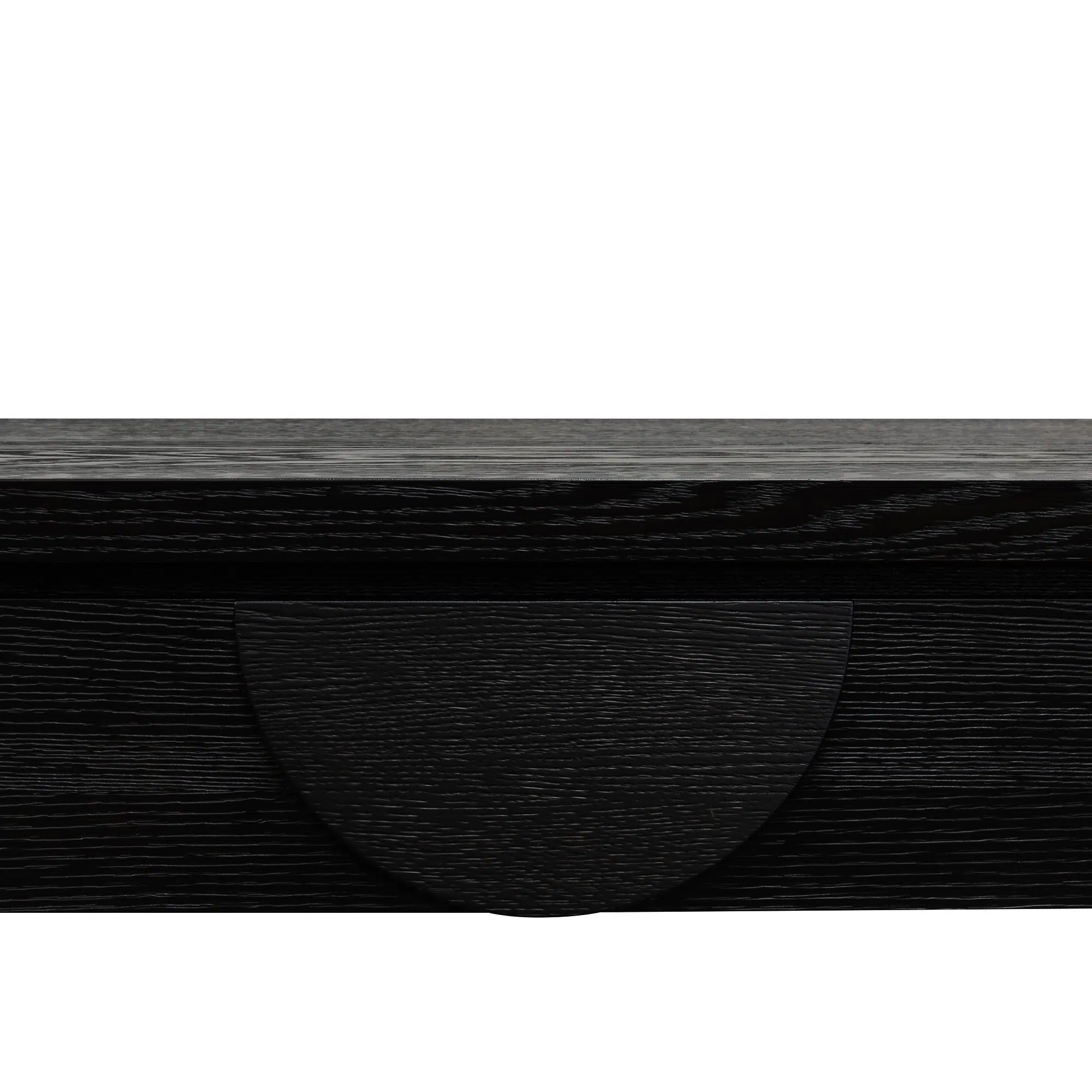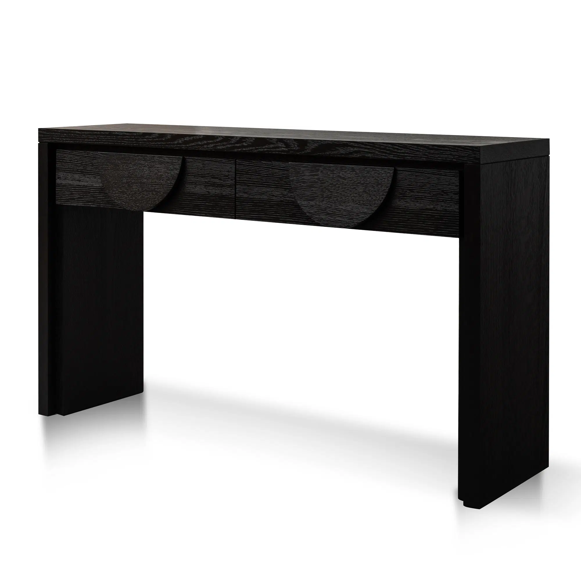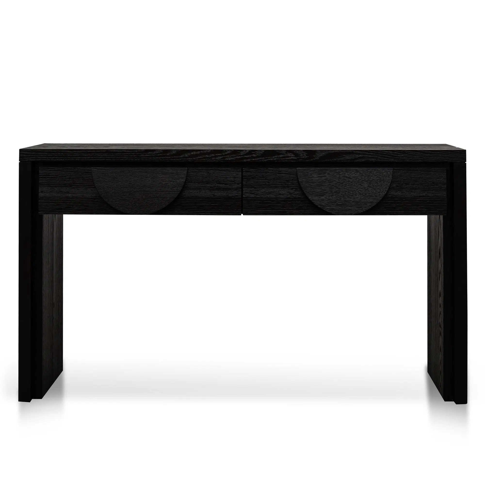 This 1.4m console table redefines contemporary elegance with its textured espresso black finish and minimalist silhouette. The deep black stained oak veneer surface creates a rich, tactile experience, while the curved half-moon handles add subtle sophistication. Perfect for entryways, living rooms, or hallway spaces, its neutral palette complements both bold and neutral interiors.