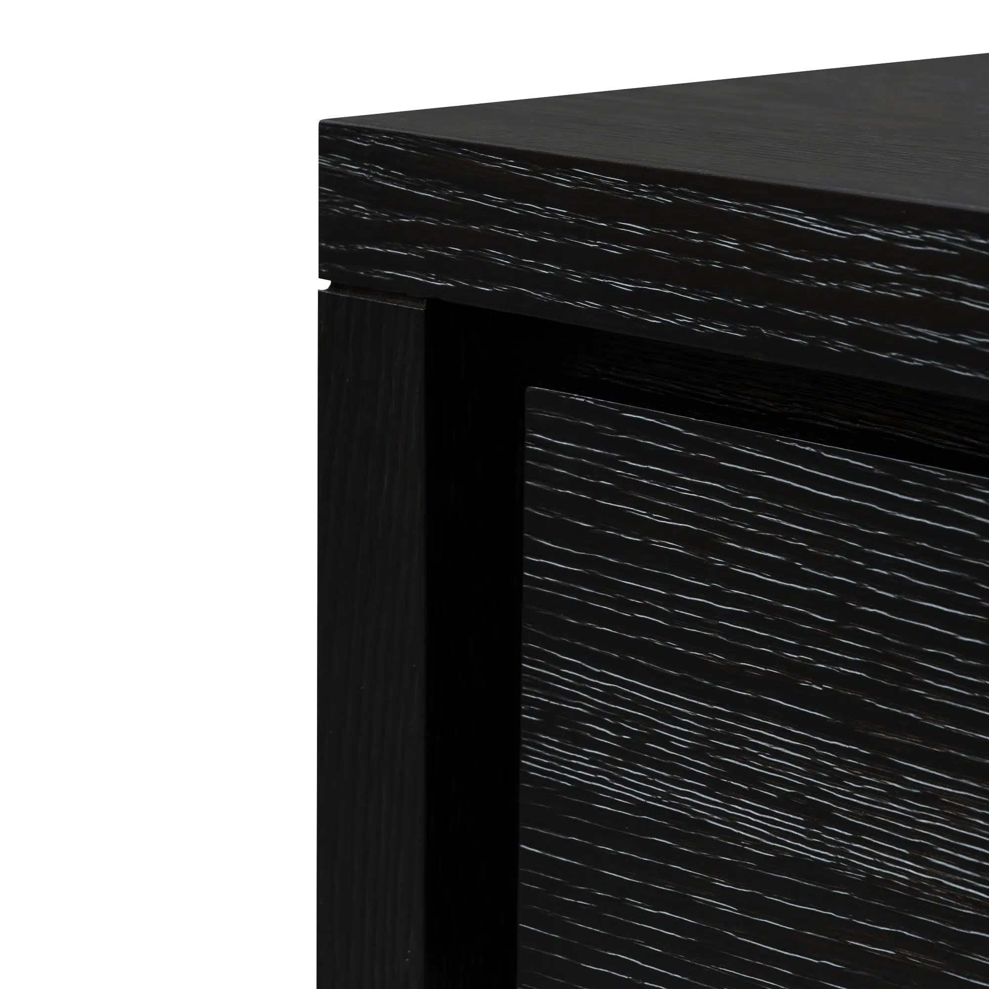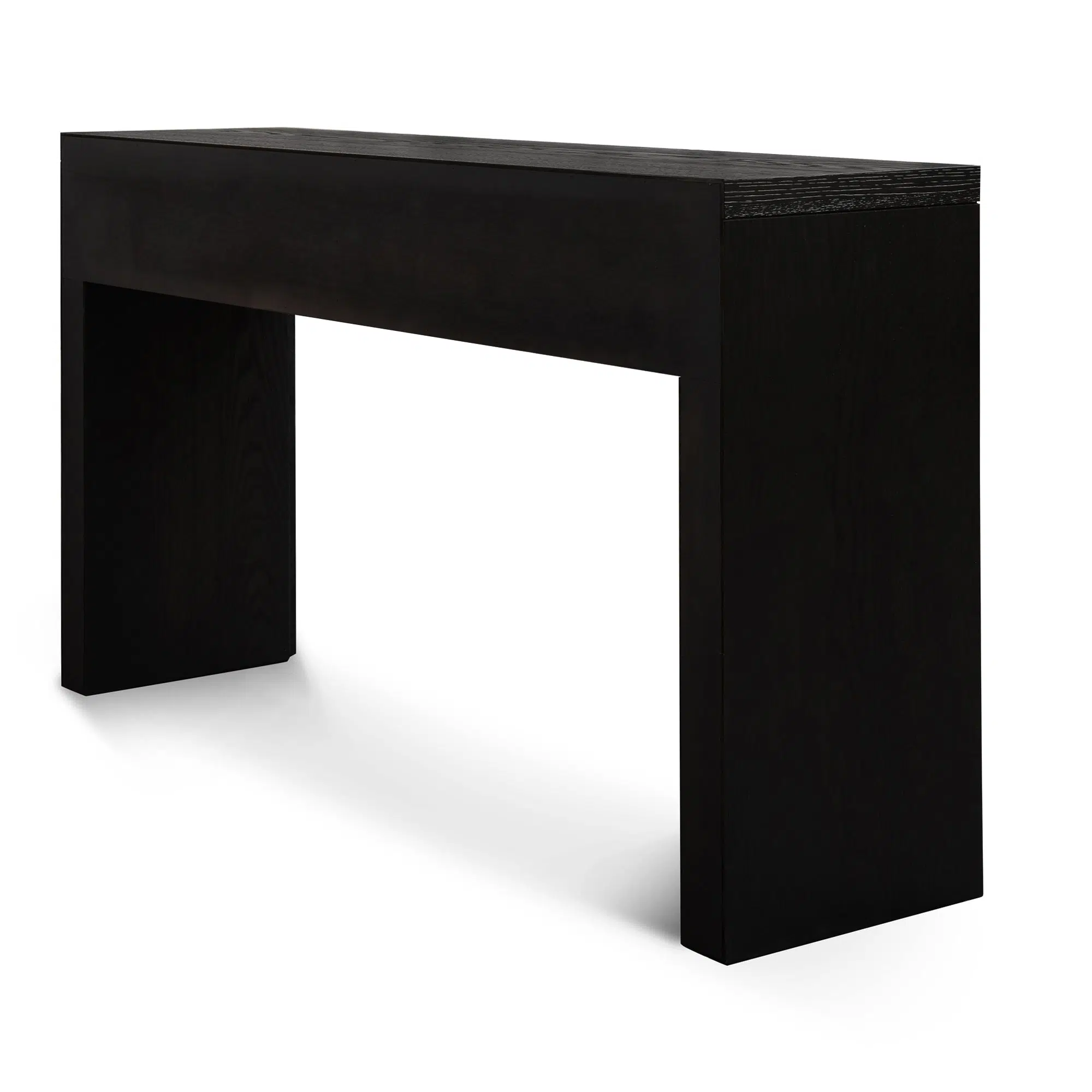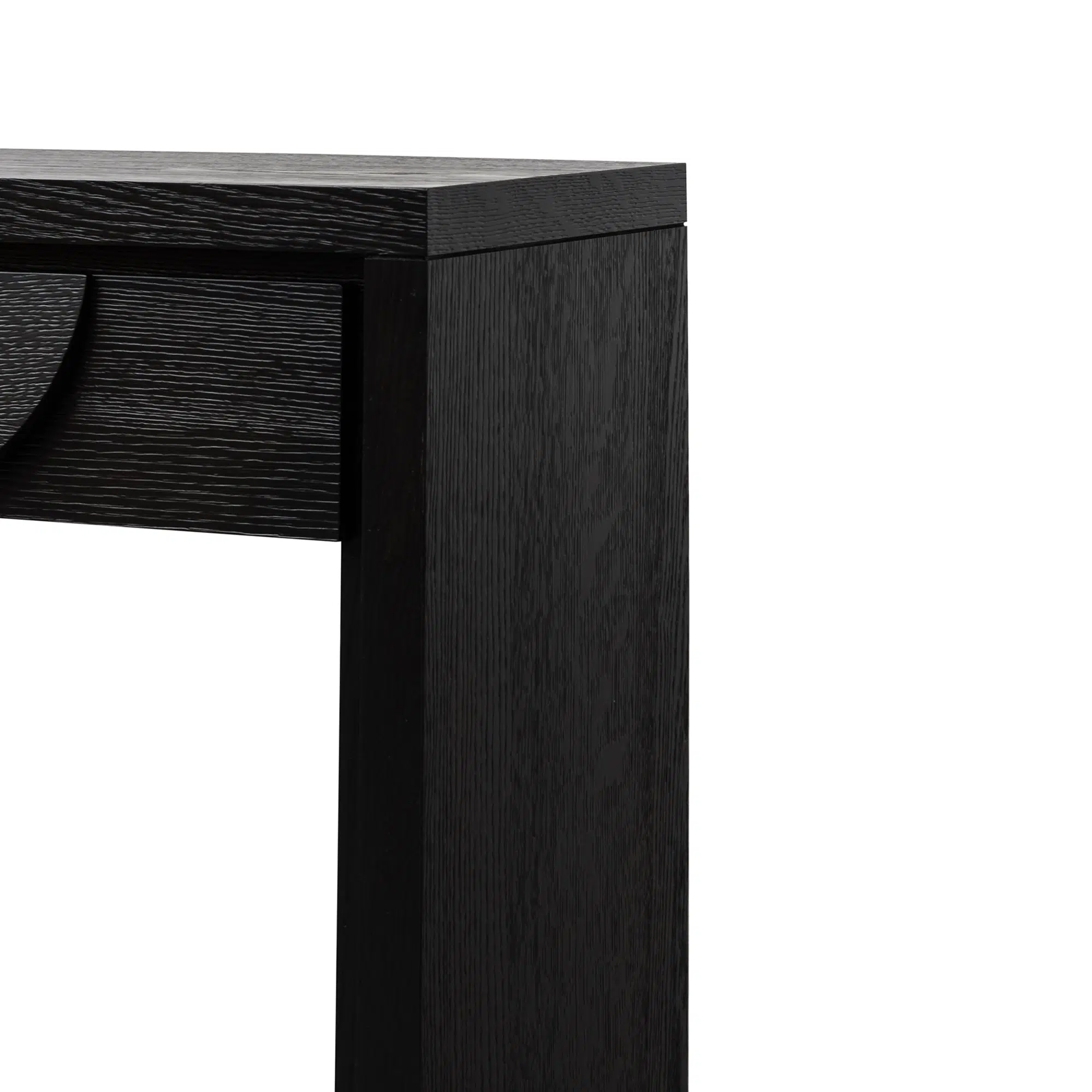 This 1.4m console table redefines contemporary elegance with its textured espresso black finish and minimalist silhouette. The deep black stained oak veneer surface creates a rich, tactile experience, while the curved half-moon handles add subtle sophistication. Perfect for entryways, living rooms, or hallway spaces, its neutral palette complements both bold and neutral interiors.