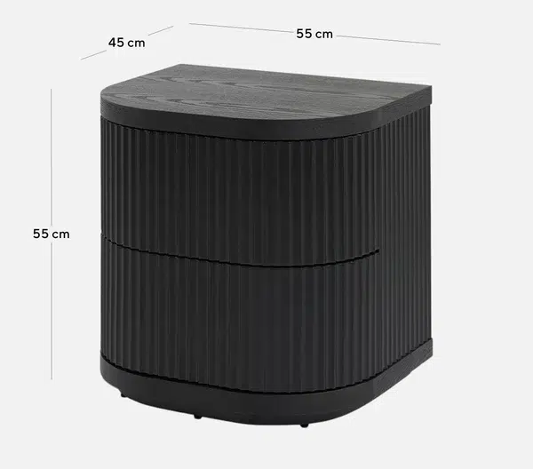 Measuring 55cm (W) x 45cm (D) x 55cm (H), this compact nightstand fits effortlessly beside beds or sofas without overwhelming small spaces. Two full-extension drawers provide ample room for organizing bedding accessories, jewelry, or electronics, ensuring clutter-free surfaces.