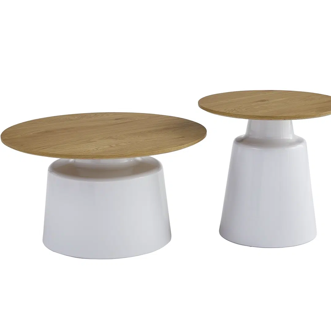 This nesting coffee table combines sleek, contemporary design with functional durability. The table features a realistic oak-effect MDF top that mimics natural woodgrain textures, paired with a sturdy white powder-coated metal frame for long-lasting stability. Its minimalist silhouette and neutral tones effortlessly complement modern living rooms, lounges, or compact apartments. With dimensions reaching 3846mm in height and 7050mm in width, the piece balances generous proportions with a streamlined profile.