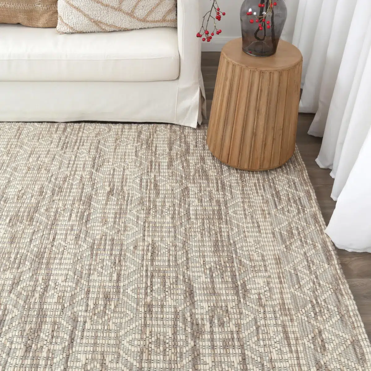 The Copacabana rug features a refined palette of natural and neutral hues, making it suitable for modern, coastal, tribal, and bohemian spaces. Its understated tones complement various furnishings with ease.