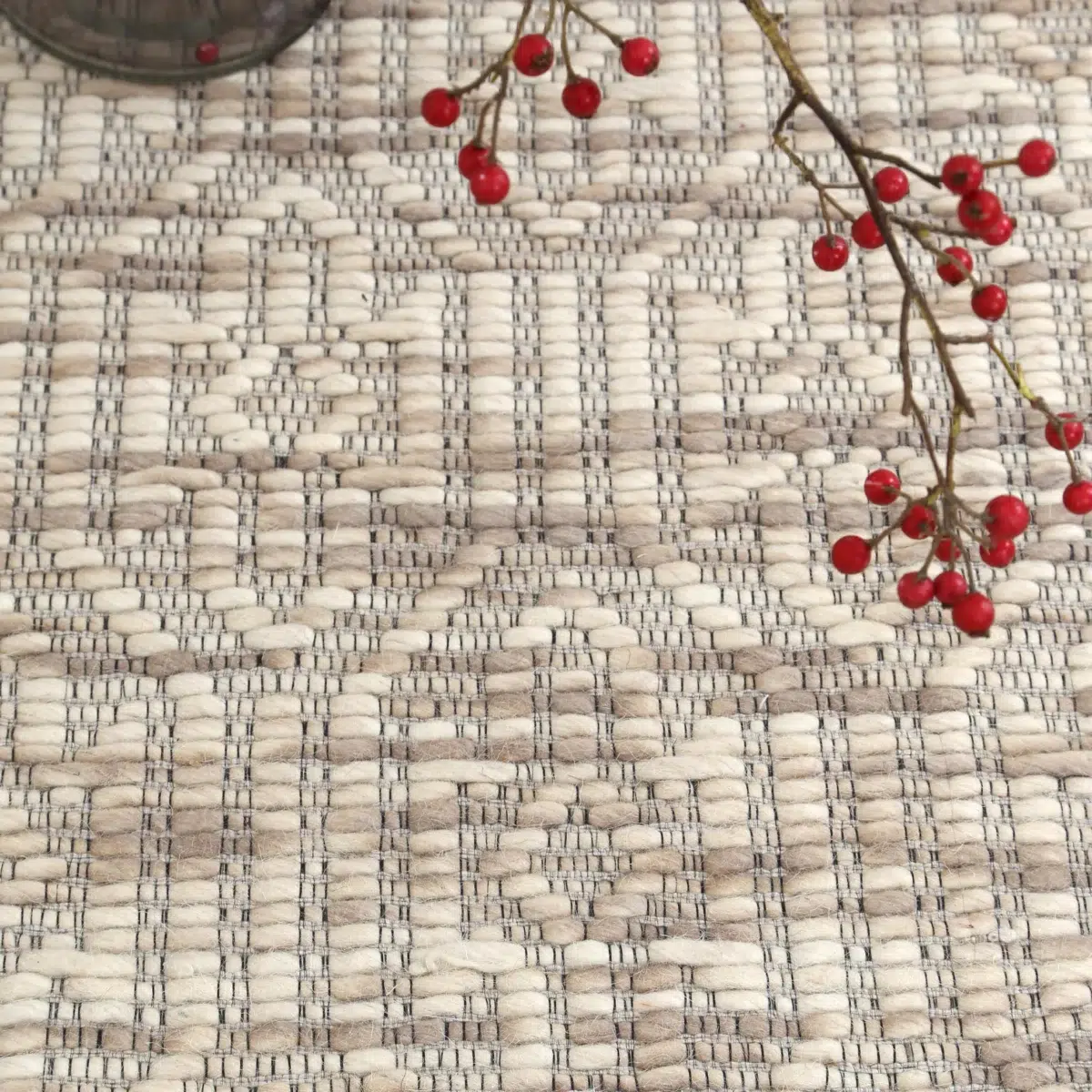 Constructed from 80% wool and 20% polyester with a cotton canvas backing, the rug balances softness, strength, and practicality. Its flatwoven loop structure ensures long-lasting use and effortless maintenance.