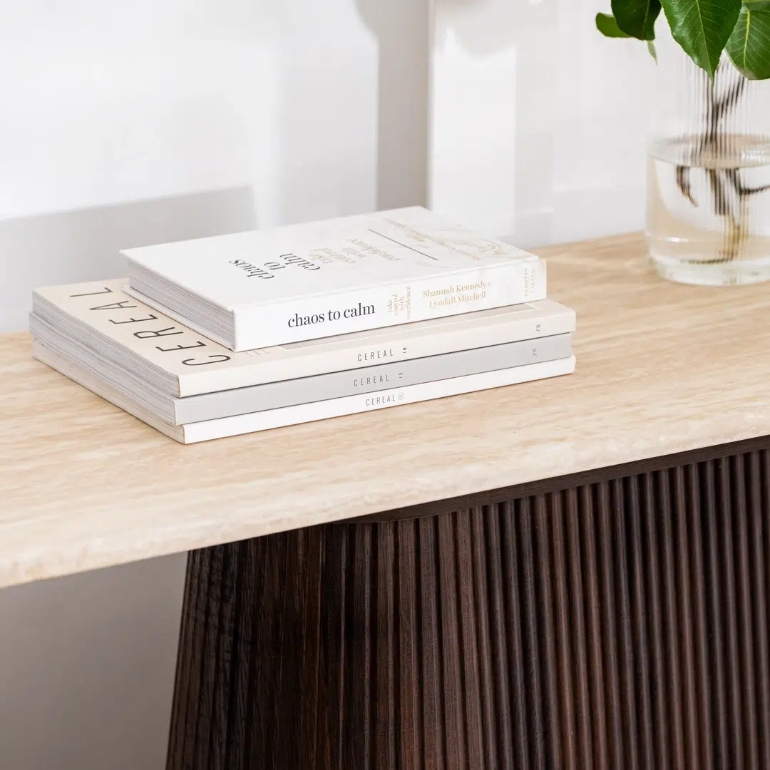 The table’s matte artificial marble top mimics the natural veining and texture of travertine, adding a touch of organic elegance to your decor. Perfect for displaying statement vases, photo frames, or a curated collection of books, the durable surface resists wear while maintaining its polished appearance through years of use.