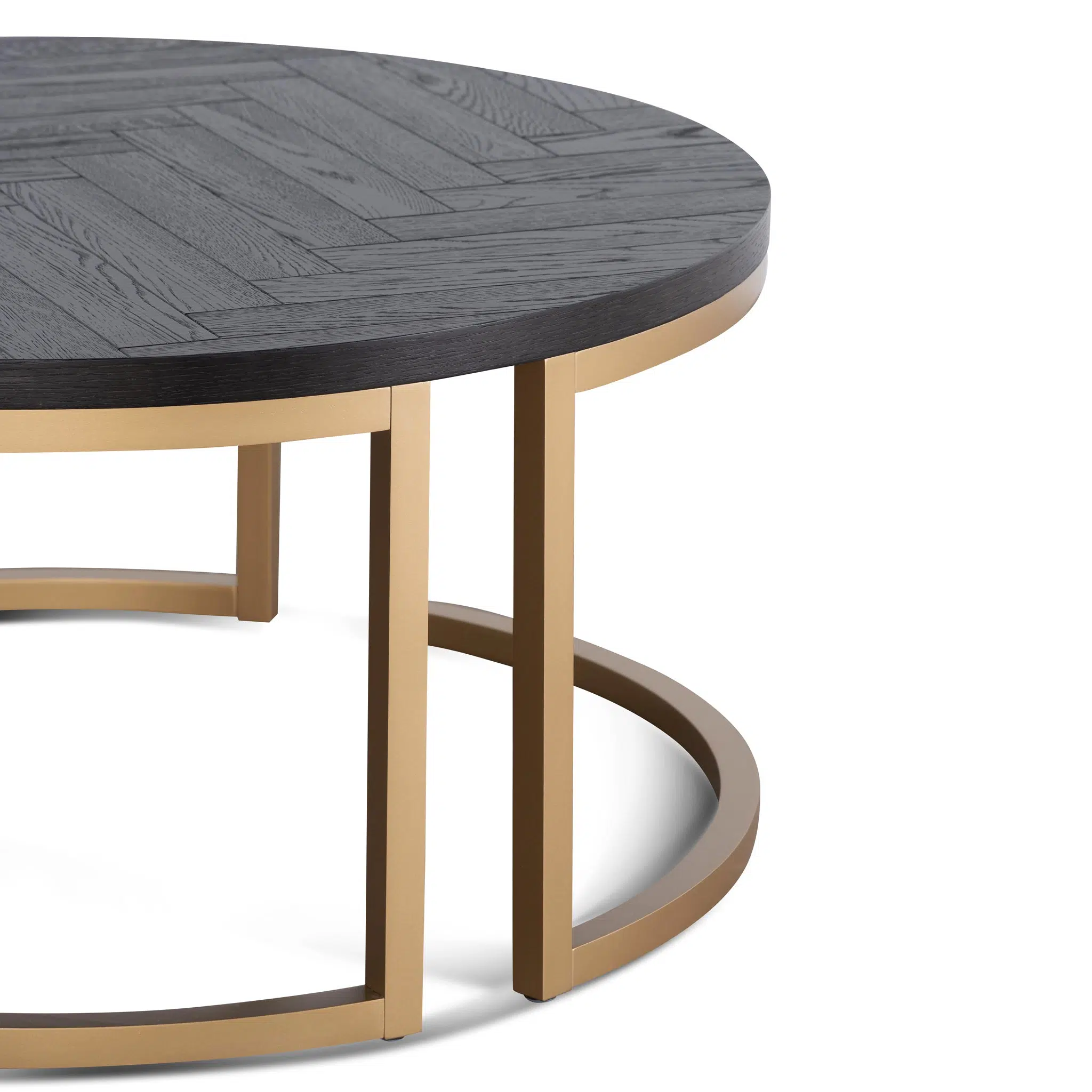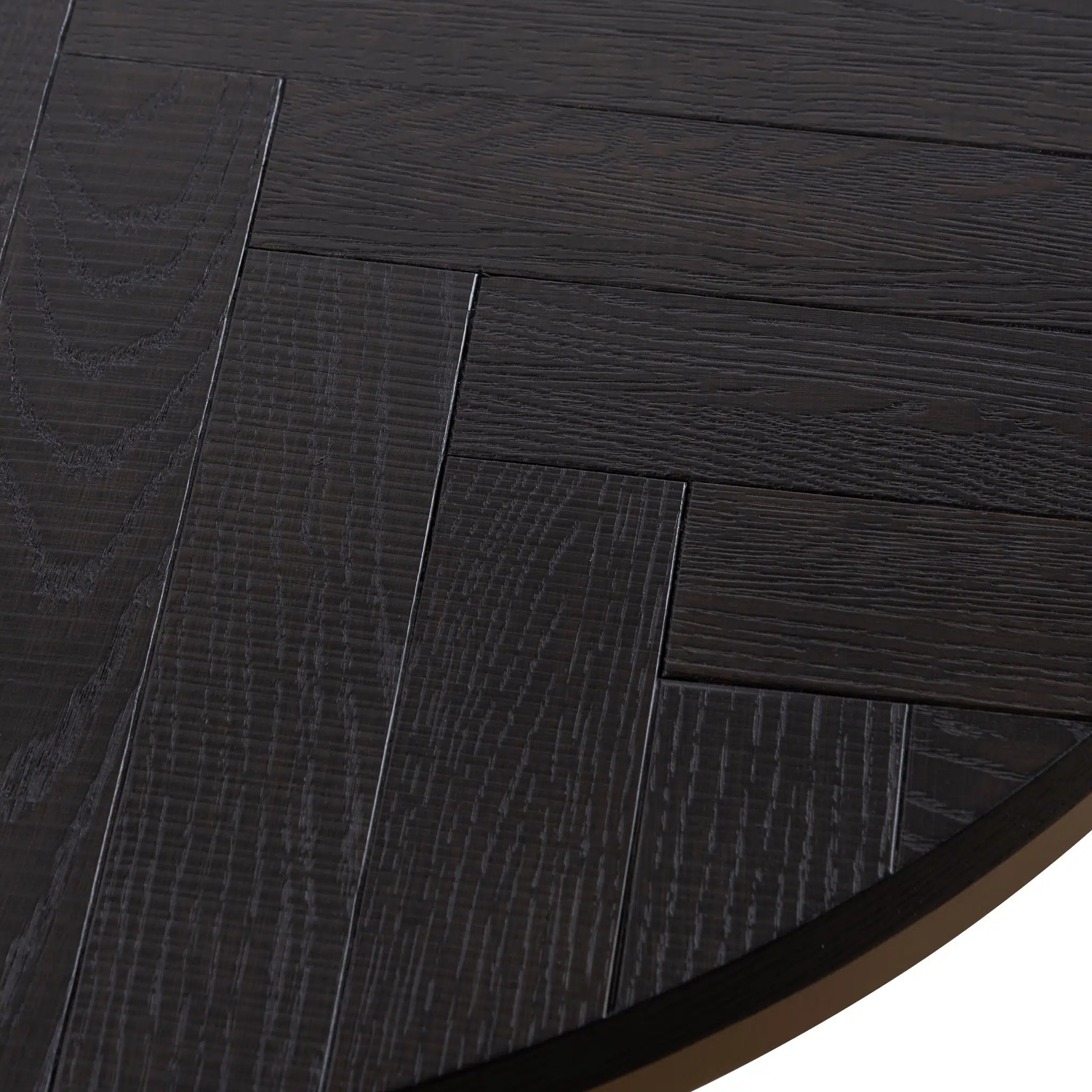 This round coffee table effortlessly blends natural elegance with modern luxury, featuring a striking herringbone-patterned tabletop crafted from premium American white oak. The European beech base, finished in a brushed gold hue, adds a touch of opulence, creating a centerpiece that elevates any living room or lounge area with its refined silhouette and designer-inspired ambiance.
