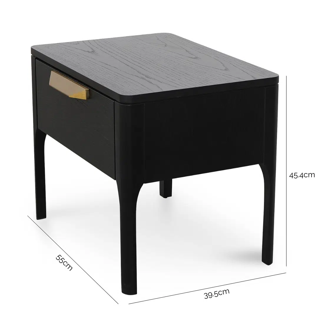 The CST2809-CN Bedside Table features a sleek black veneer finish that exudes contemporary elegance, complemented by a bold brass geometric handle. This minimalist design seamlessly integrates into modern bedroom aesthetics while adding a touch of refined sophistication through its clean lines and subtle metallic accents.