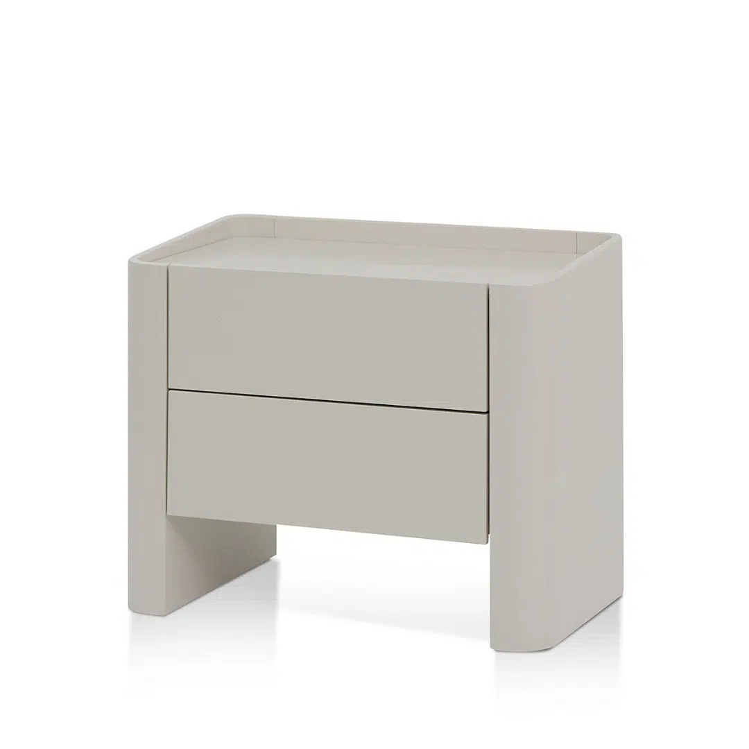 This bedside table features a captivating warm grey matte paint finish that exudes modern elegance, blending seamlessly into contemporary and minimalist interiors. Its smooth, non-reflective surface adds a touch of sophistication while maintaining a subtle, refined aesthetic. The curved edges and matte top enhance its visual appeal, making it a stylish focal point in any bedroom or living space.