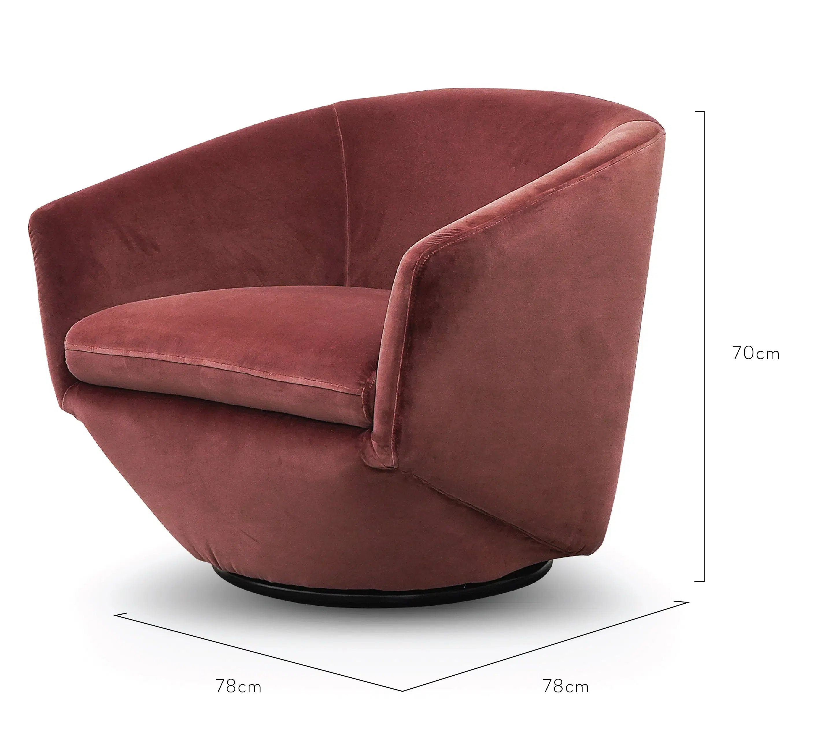 The Blood Orange swivel lounge chair makes a bold visual statement with its vibrant hue and modern graphic silhouette. This eye-catching piece combines luxurious velvet upholstery with a sculptural frame, offering a contemporary twist on classic lounging that complements both minimalist and eclectic interiors.