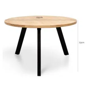 With a diameter of 125cm and a height of 73cm, the table provides ample space for four people to gather comfortably. The rounded edges soften the industrial look, creating a welcoming atmosphere for family meals or social gatherings. The lightweight black metal base ensures stability without overwhelming the room’s existing decor.