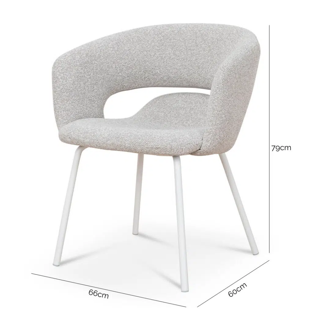 This chair seamlessly blends modern aesthetics with timeless elegance, featuring a streamlined silhouette and arched backrest that adapts effortlessly to various interior styles. Its clay grey polyester upholstery adds a subtle texture, while the white metal frame creates a harmonious contrast with the fabric seat, making it a versatile choice for dining areas, kitchens, or living spaces.