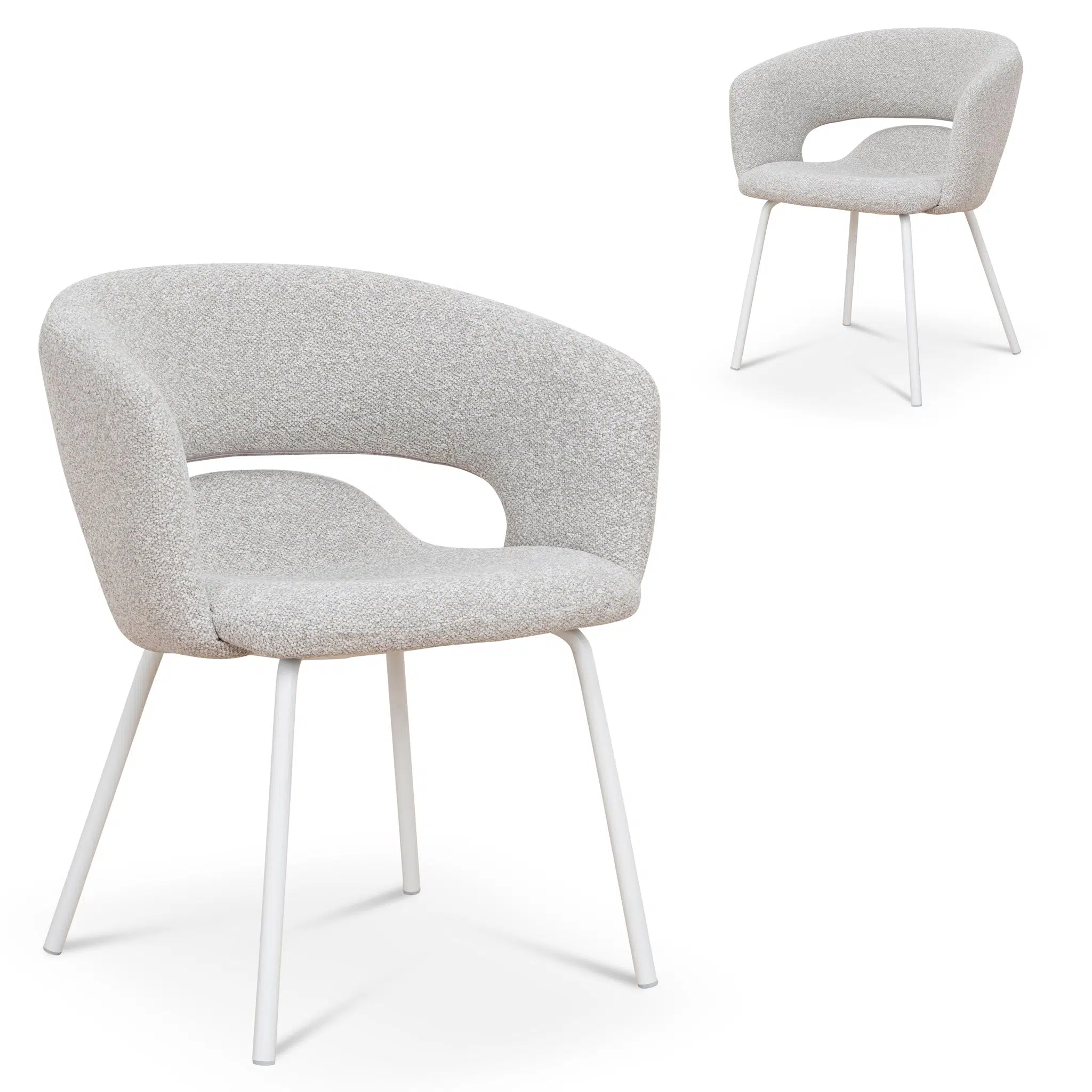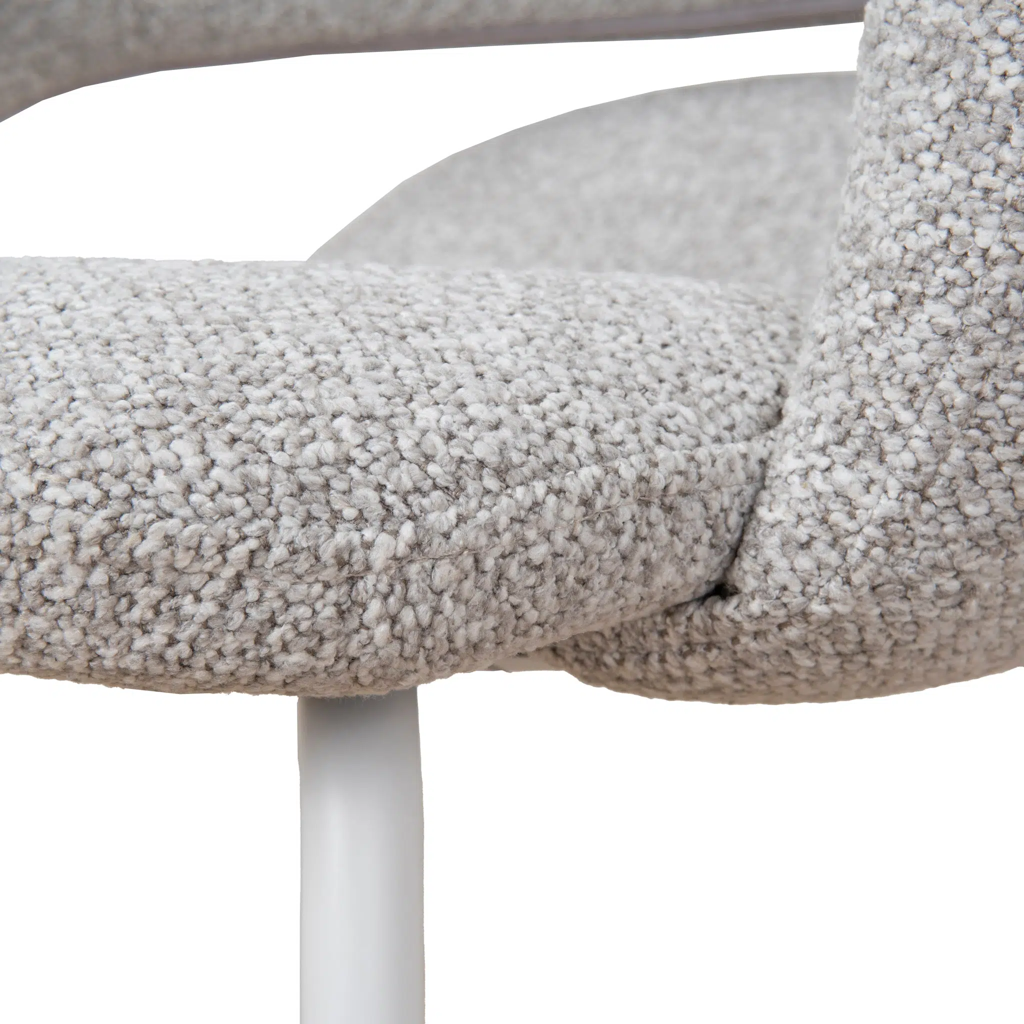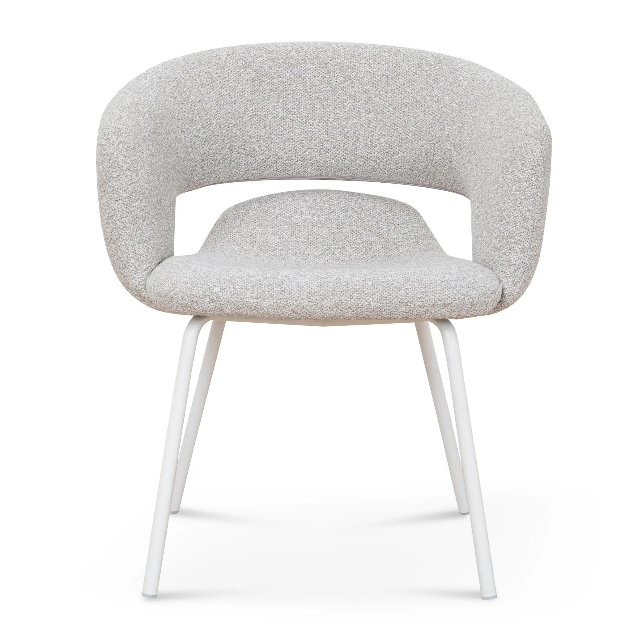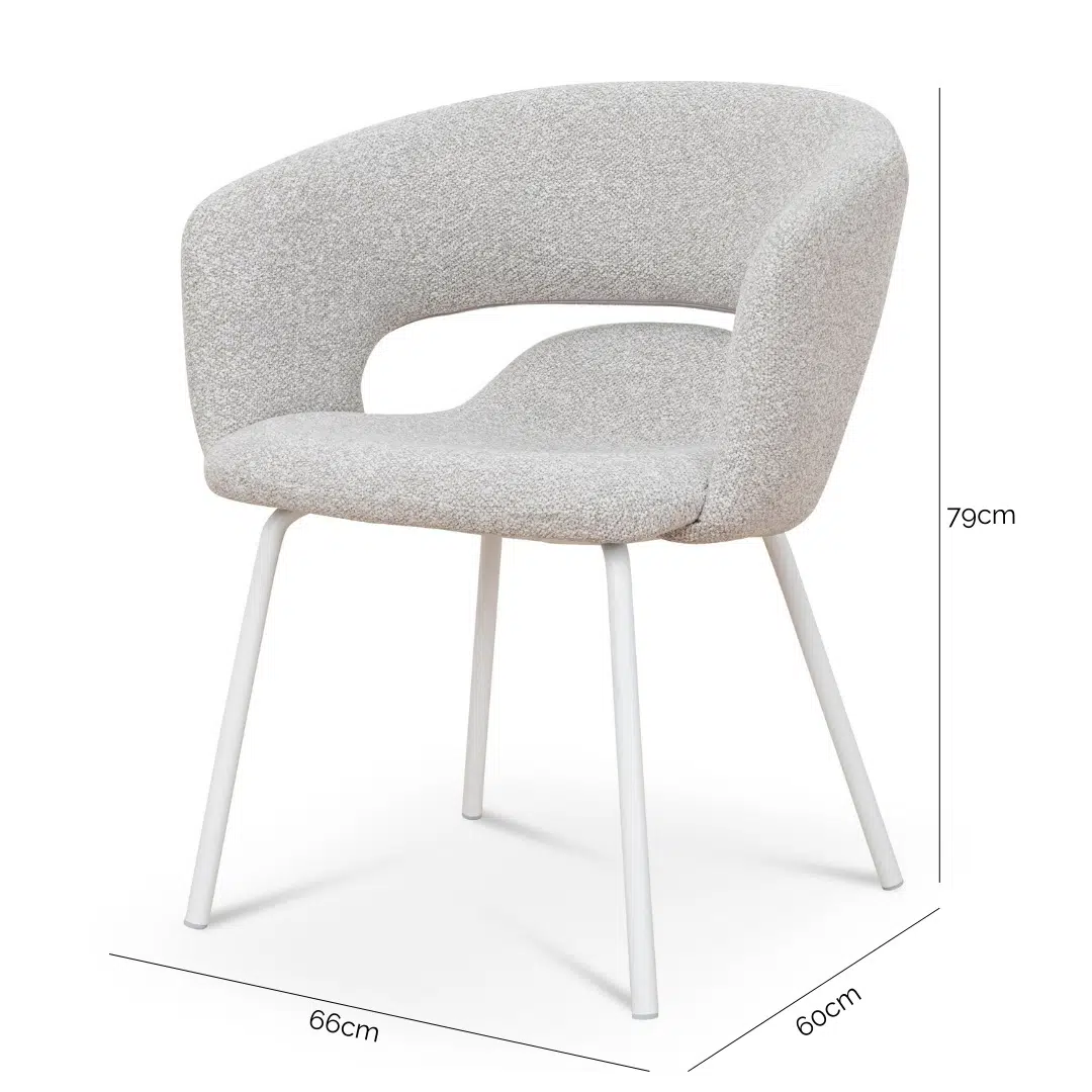 This chair seamlessly blends modern aesthetics with timeless elegance, featuring a streamlined silhouette and arched backrest that adapts effortlessly to various interior styles. Its clay grey polyester upholstery adds a subtle texture, while the white metal frame creates a harmonious contrast with the fabric seat, making it a versatile choice for dining areas, kitchens, or living spaces.