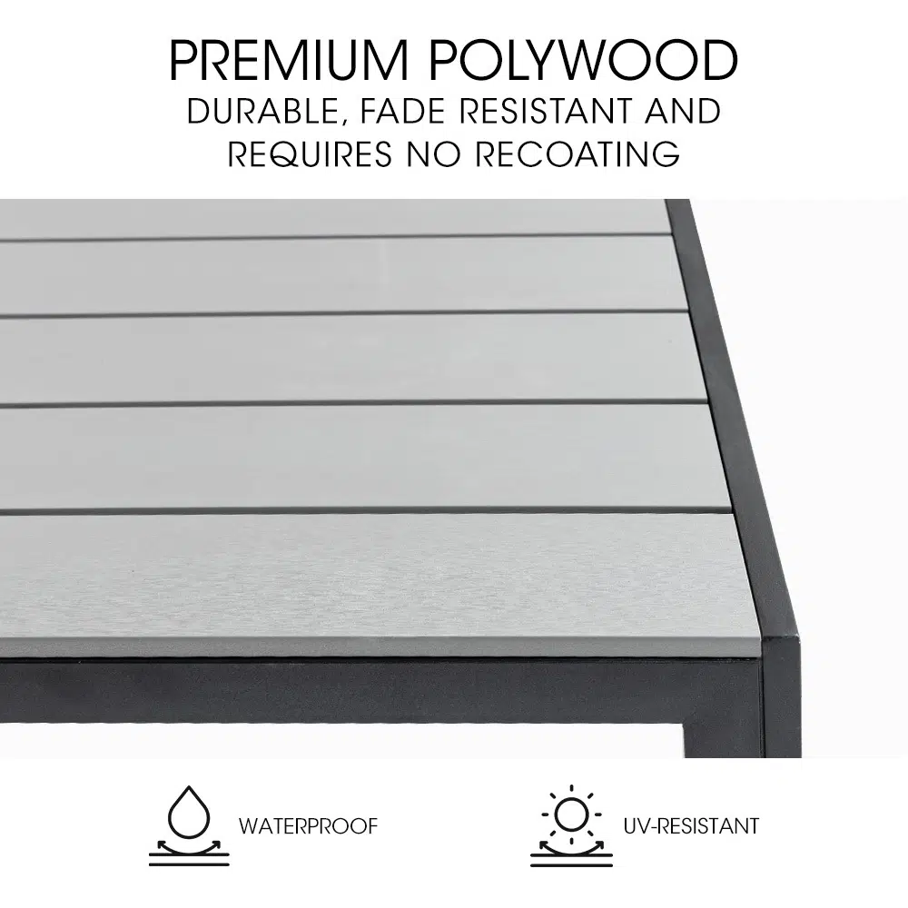 The table features a premium polywood tabletop that mimics the look of natural wood while offering exceptional resistance to fading, moisture, and extreme weather. This low-maintenance material eliminates the need for sealing, painting, or frequent cleaning, ensuring it remains visually appealing for years. The 90cm x 90cm tabletop provides ample space for six to eight people, with a height of 72cm for comfortable seating.