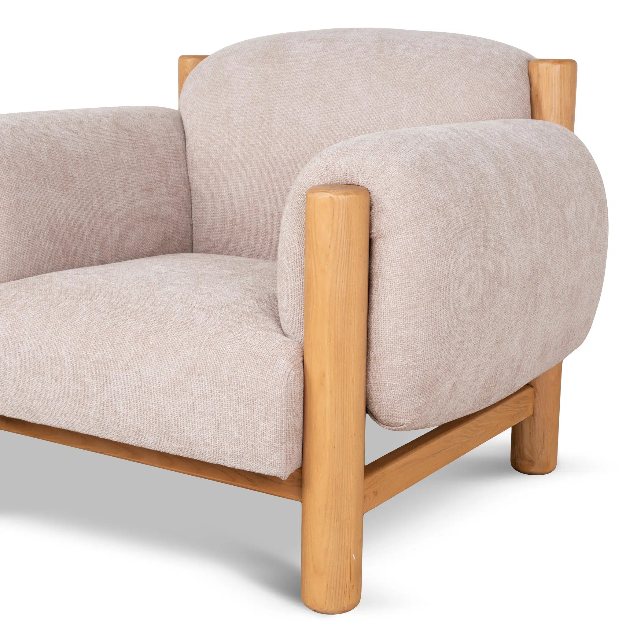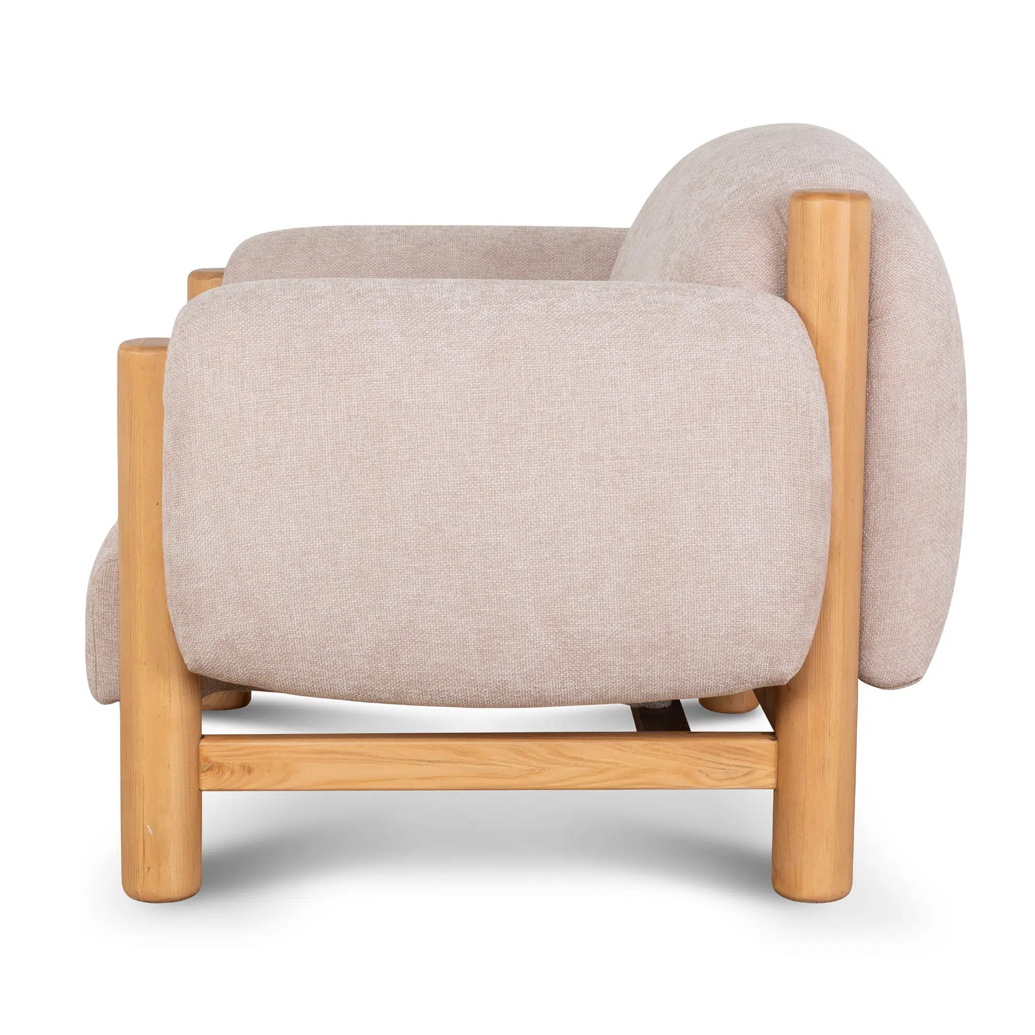 Crafted to elevate your living space, this armchair blends understated elegance with modern sophistication. The blush linen upholstery adds a warm, inviting touch, while the solid elm wood frame ensures lasting durability. Its curved silhouette and neutral tone create a versatile piece that seamlessly complements both traditional and contemporary interiors, transforming any room into a sanctuary of refined style.