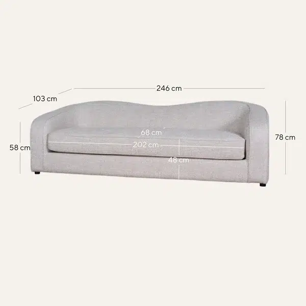 Measuring 246cm in width with a 202cm seating area, this sofa provides generous space for three adults to relax. The 48cm seat height ensures easy access, while the 58cm arm height offers ideal support for both sitting and standing transitions. Designed for modern lifestyles, its low-profile silhouette maintains a sleek visual footprint despite the generous proportions.