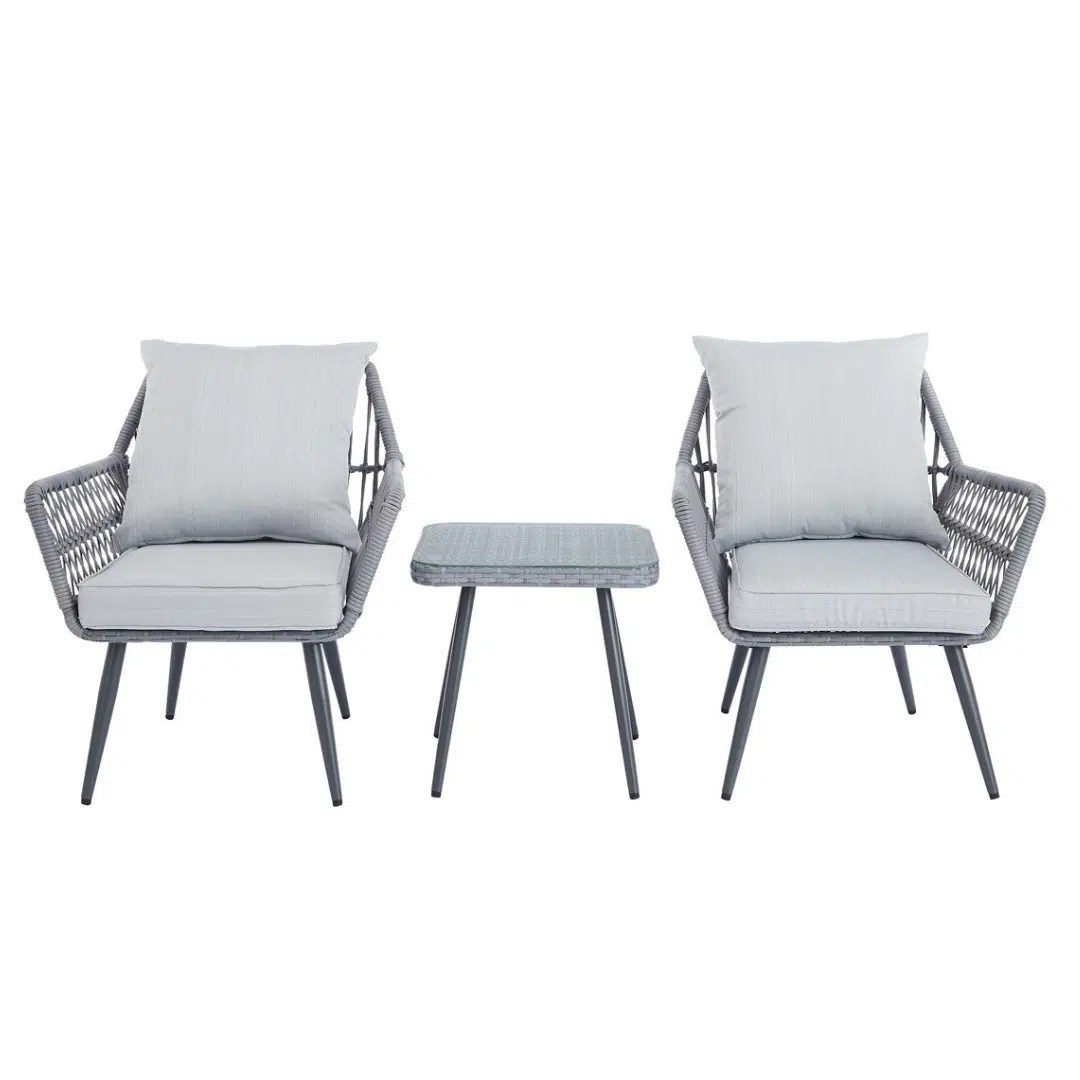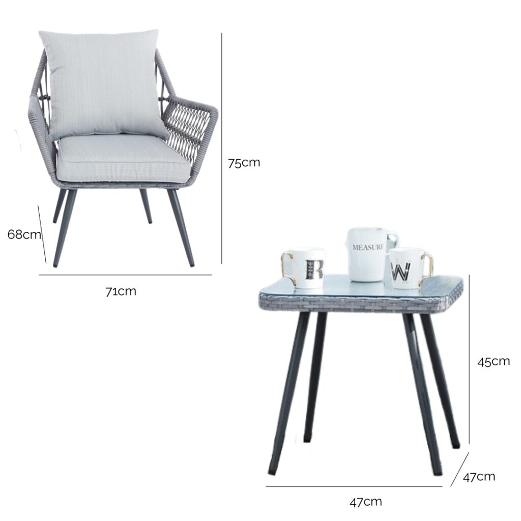 Each chair measures 71cm x 68cm x 75cm, and the table dimensions are 47cm x 47cm x 45cm, creating a balanced layout for small spaces. The set includes 4 cushions, a hardware pack, and an assembly manual for easy setup. The metal legs ensure stability, while the compact size makes it easy to rearrange or store when not in use.