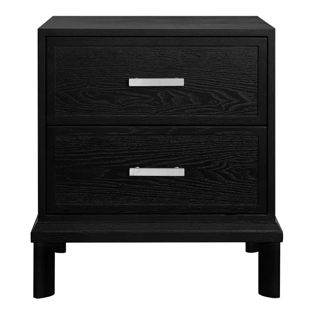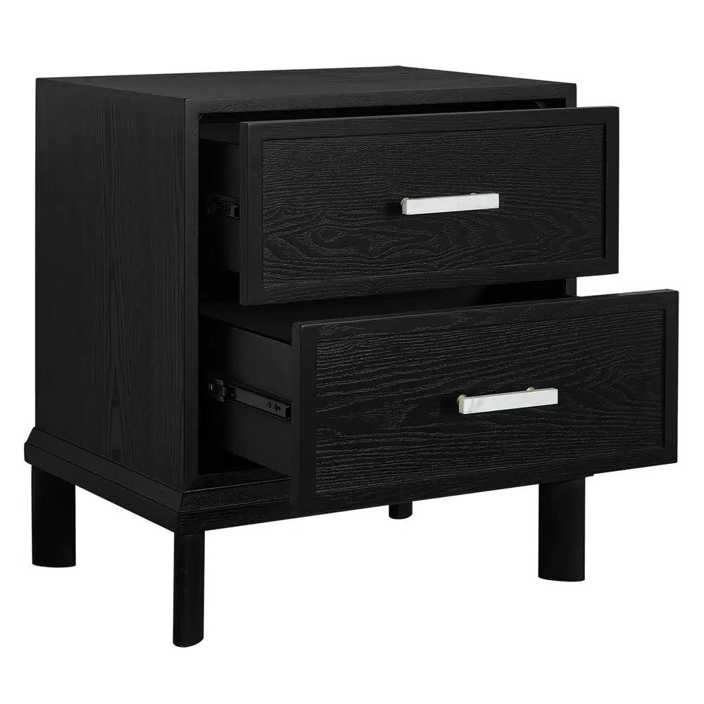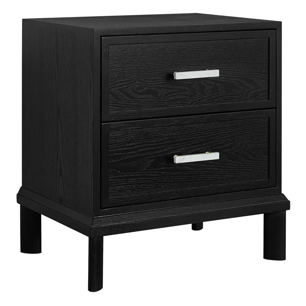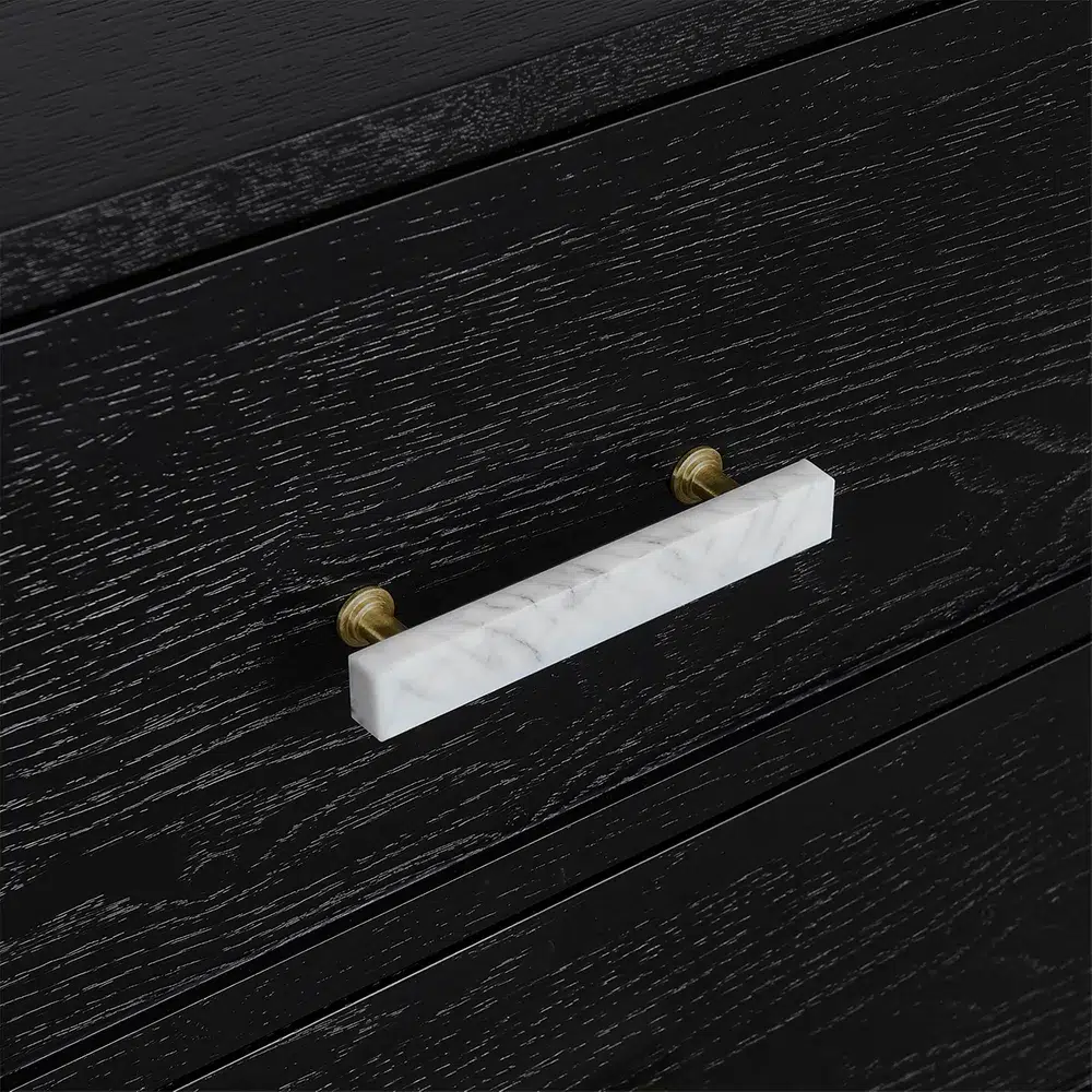 The Jill Bedside Table in Black brings a refined, contemporary look to your sleeping space. Its deep timber grain paired with a soft matte finish creates a bold yet understated presence, while the white marble drawer handles offer a striking and sophisticated contrast that elevates the overall aesthetic.