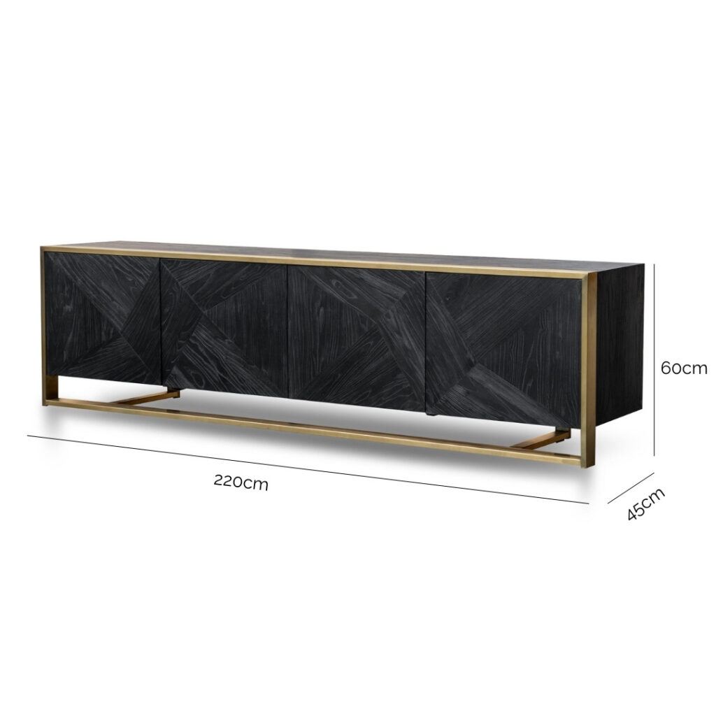 This 2.2m entertainment TV unit redefines modern living spaces with its bold fusion of industrial aesthetics and luxurious detailing. The golden brushed iron frame contrasts beautifully with the weathered black fir wood, creating a striking visual balance that transitions effortlessly from raw industrial elements to refined opulence. Perfect for contemporary homes seeking a sophisticated yet rugged centerpiece.