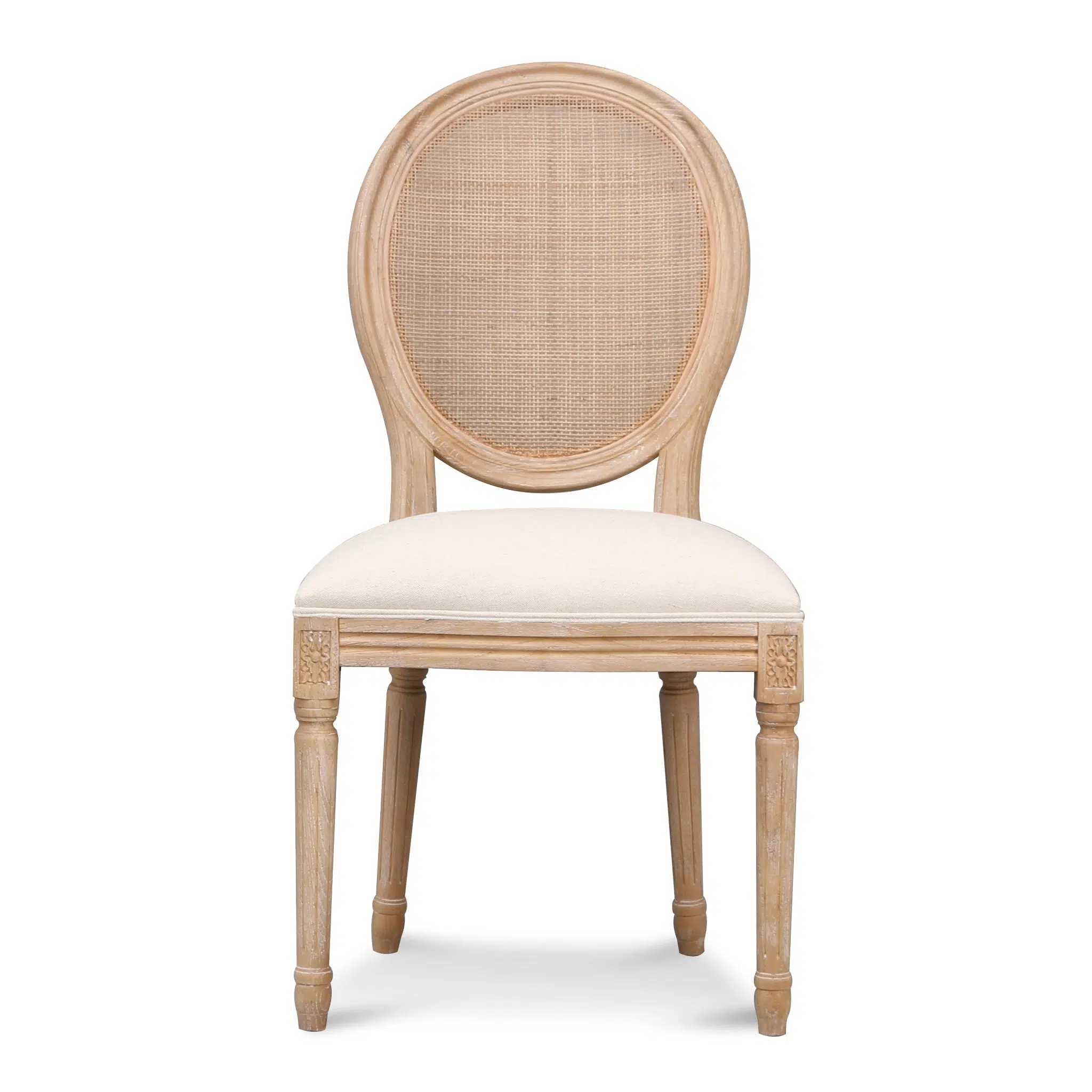 The cushioning is upholstered in a sophisticated 60/40 linen-cotton blend fabric in light beige, blending breathability with refined texture. The soft-medium firmness level, achieved through 100% foam padding, ensures all-day comfort during meals or casual seating.