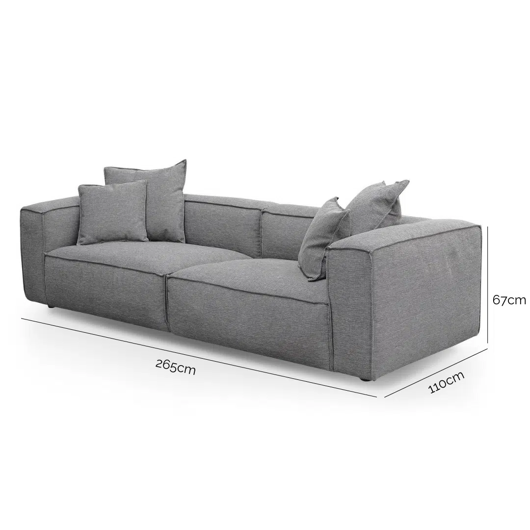 Boasting dimensions of 265cm (W) x 110cm (D) x 67cm (H), this sofa offers ample seating for four while maintaining a compact footprint. With a seat height of 42cm and depth of 76cm, it provides optimal comfort for extended use. The two separable sections allow for flexible arrangement, adapting to various room configurations or seating needs.