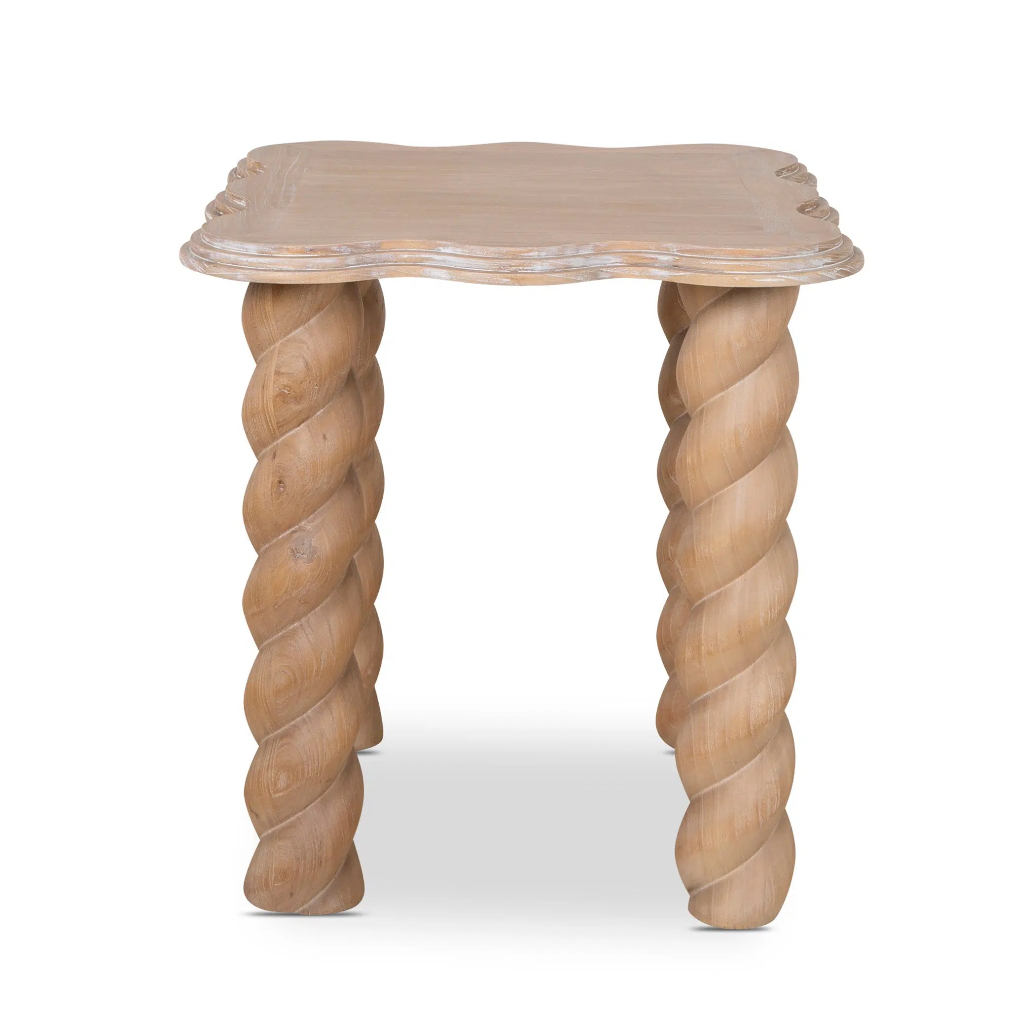 The 55cm side table features a refined, contemporary silhouette with a natural finish that seamlessly blends into modern, traditional, or rustic interiors. Its gently scalloped edges add a subtle touch of elegance, while the elegantly crafted spiral legs create a visual focal point. The combination of solid elm wood and plywood natural veneer ensures a timeless aesthetic that complements diverse decor styles.