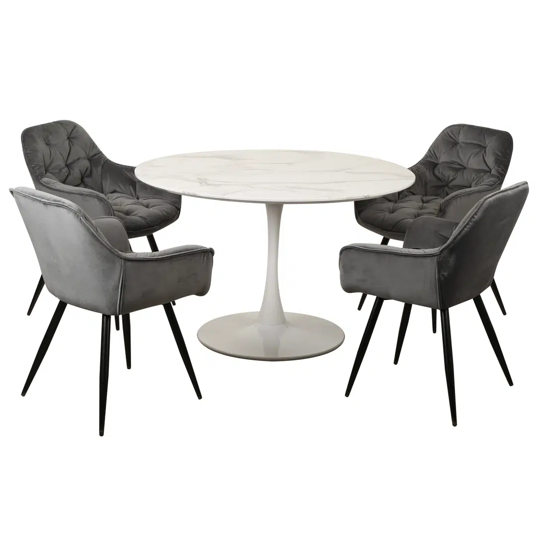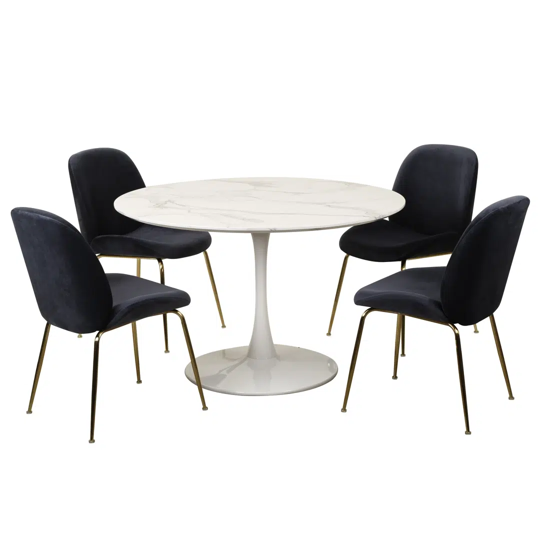 | Features: | 1 x dining table in 3 boxes, White Sevellatop: MDF with a high-gloss marble-effect laminate finish, frame: white powder-coated metal, Gloss marble finish, Sits up to six chairs, Powdercoated white pedestal base |