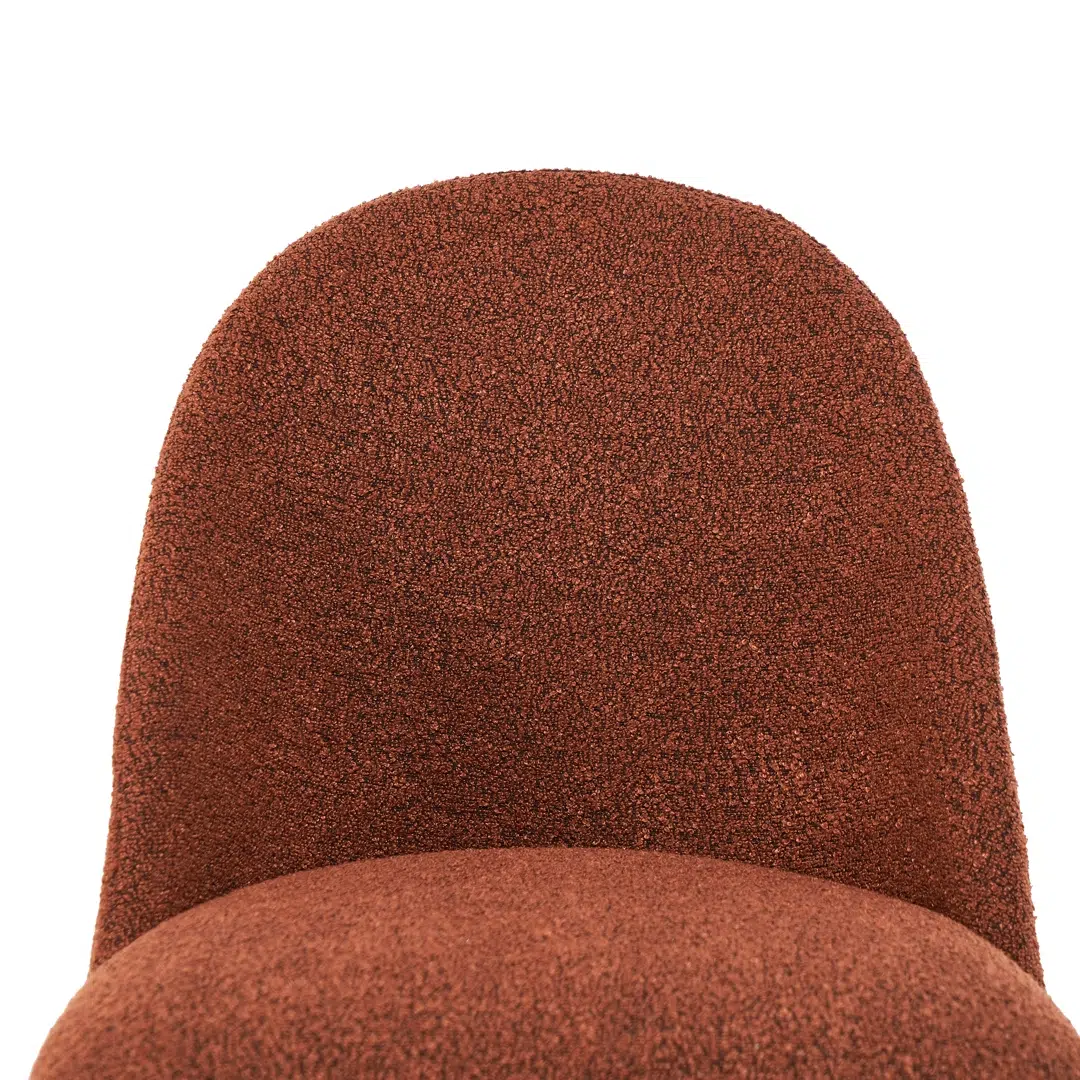 This contemporary dining chair redefines sophistication with its textured boucle fabric in warm terracotta tones and sleek, sculptural curves. The high-back design adds visual drama while maintaining a minimalist profile, making it ideal for modern dining rooms, open-concept kitchens, or upscale home cafes.