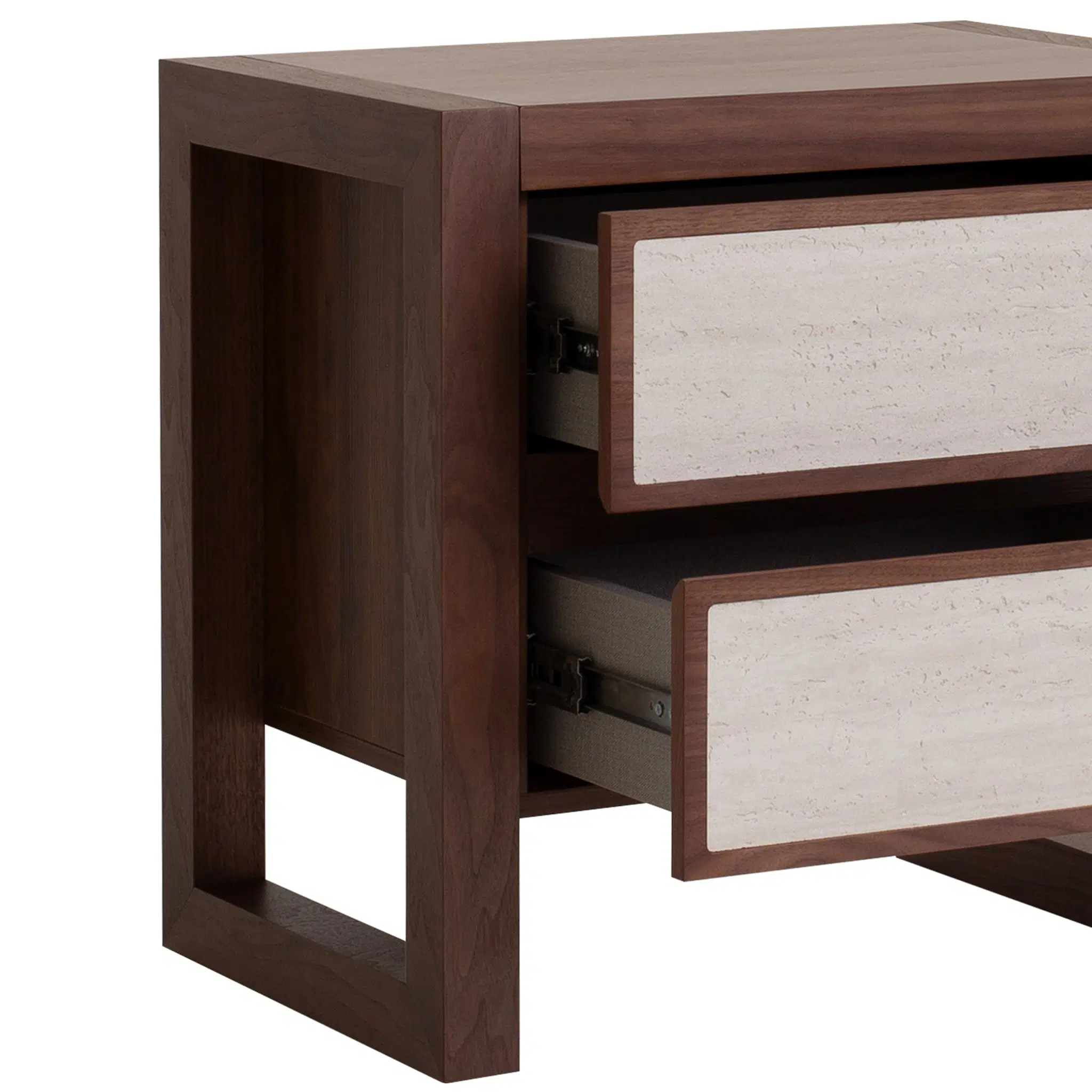 The standout design element is the unique flexible stone panels on the drawer fronts, which create a striking visual contrast against the warm walnut finish. These panels preserve the natural texture and color variation of real stone, adding a dimensional quality to the 60cm-wide surface. The 58.5cm overall height accommodates standard mattress heights while maintaining proportionate scale.