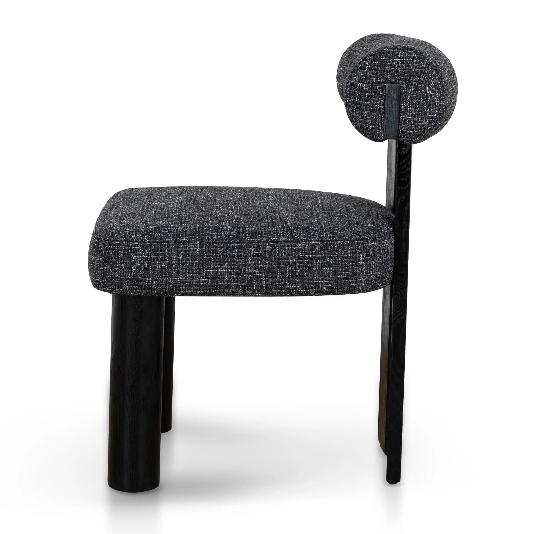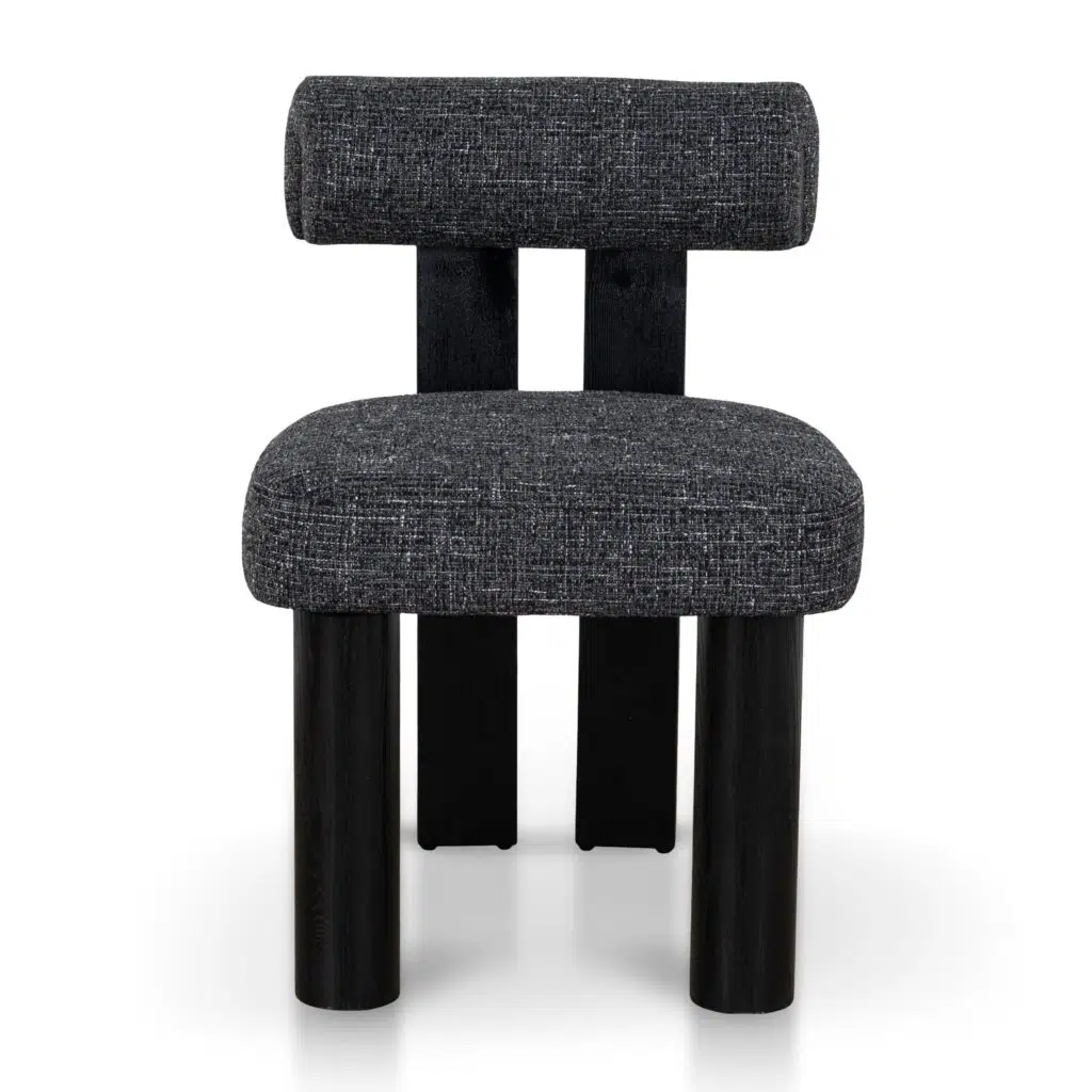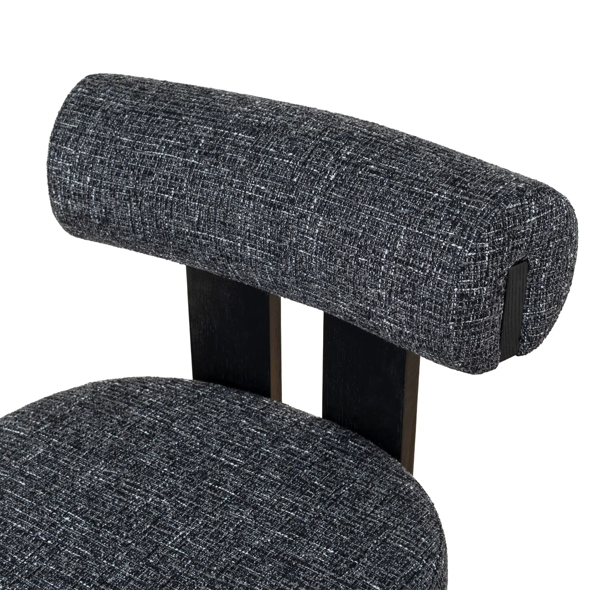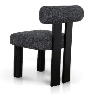 Crafted with a sleek profile and curved cylindrical backrest, this dining chair combines minimalist aesthetics with functional sophistication. The field charcoal polyester upholstery delivers a soft, matte finish that complements modern and traditional interiors alike. Measuring 52cm (W) x 62cm (D) x 79cm (H), its compact footprint ensures seamless integration into spaces of any size while maintaining a commanding presence.