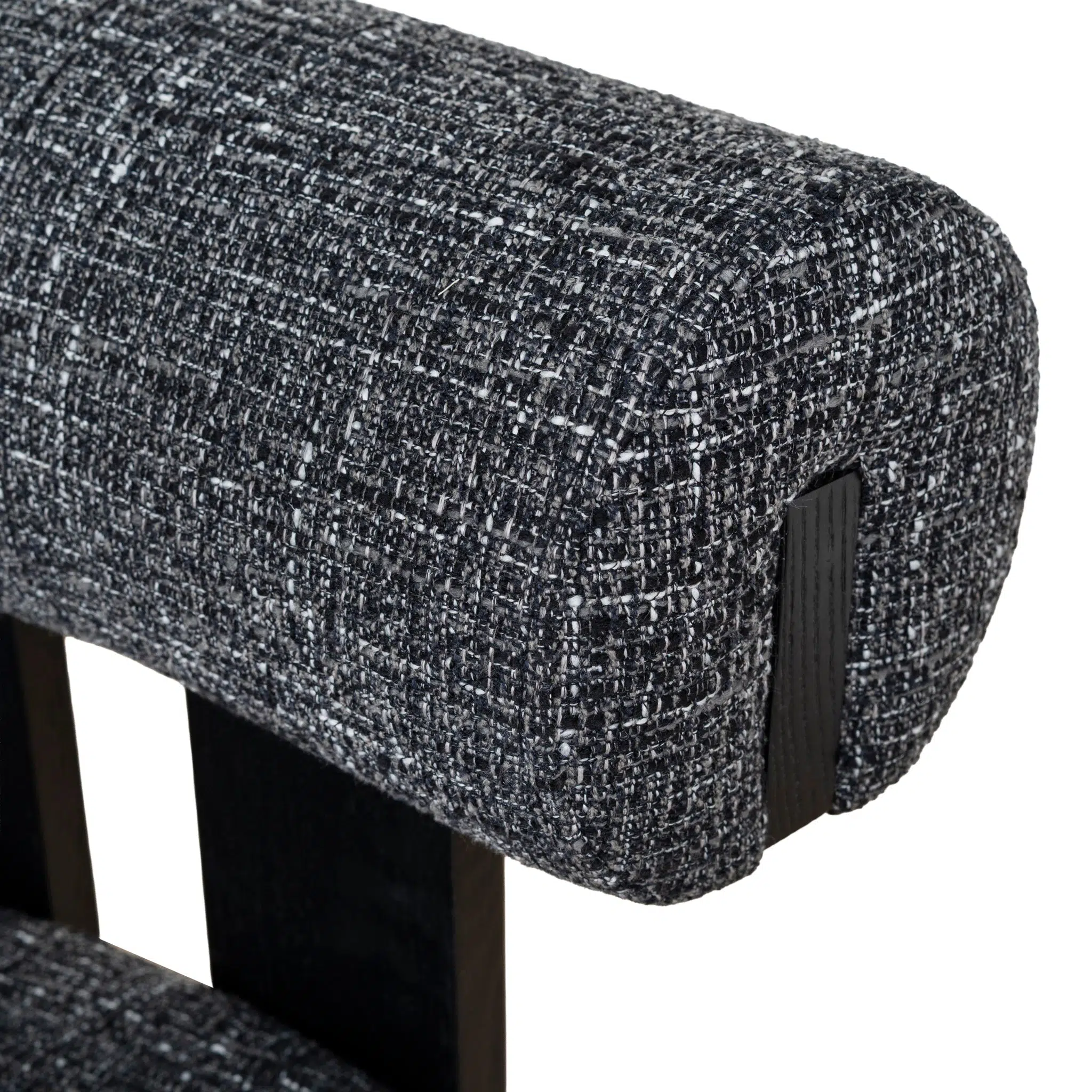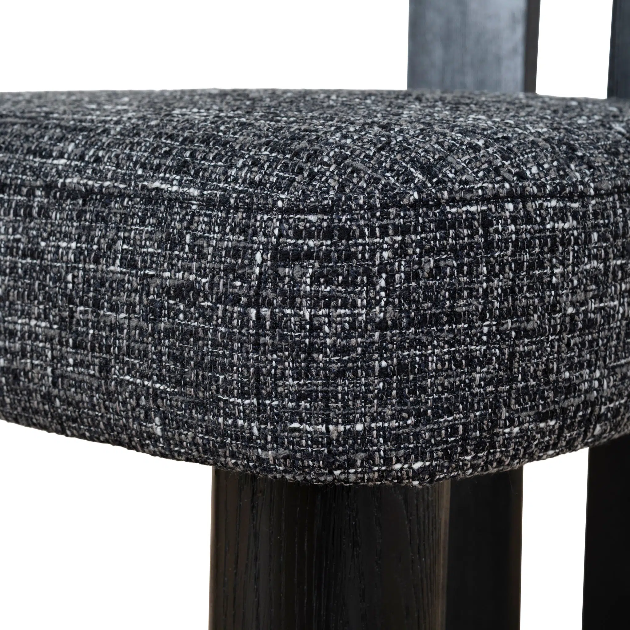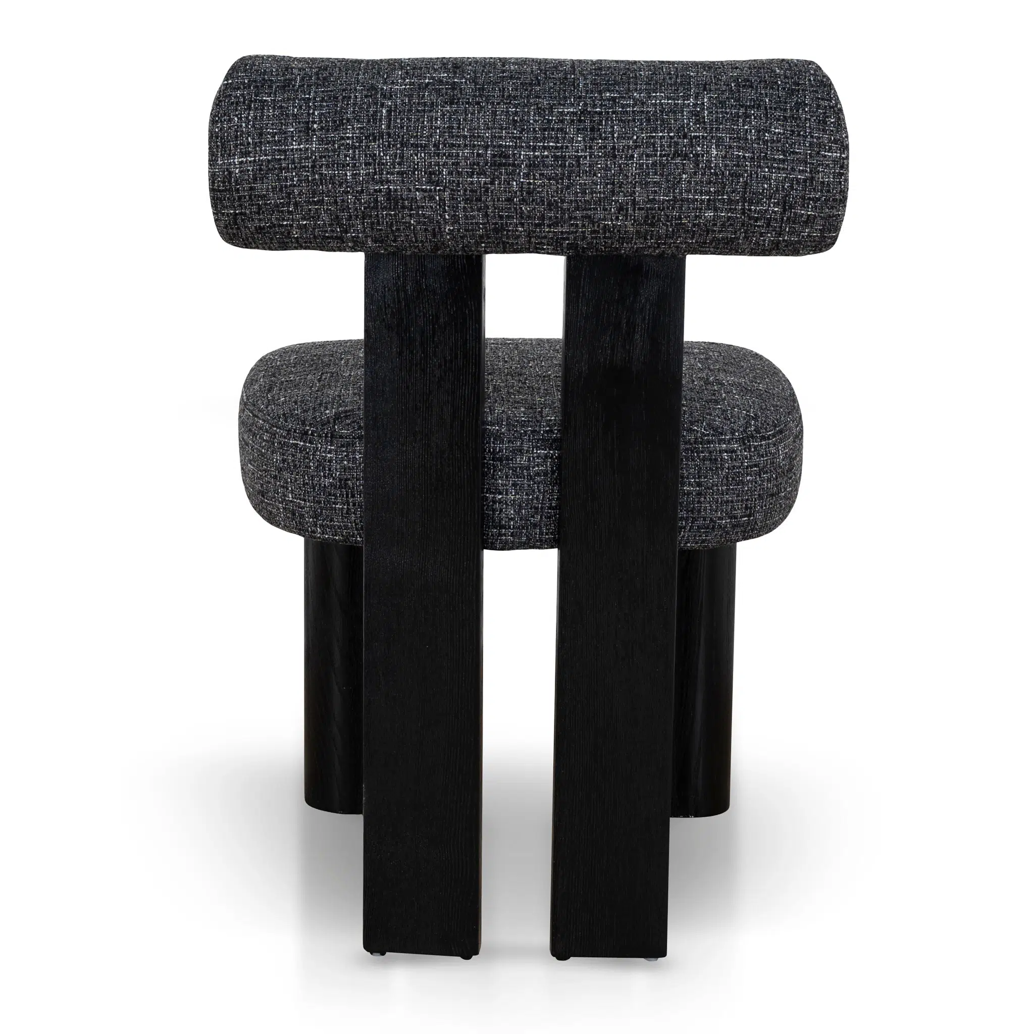 Crafted with a sleek profile and curved cylindrical backrest, this dining chair combines minimalist aesthetics with functional sophistication. The field charcoal polyester upholstery delivers a soft, matte finish that complements modern and traditional interiors alike. Measuring 52cm (W) x 62cm (D) x 79cm (H), its compact footprint ensures seamless integration into spaces of any size while maintaining a commanding presence.