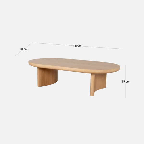 Crafted from engineered wood with a smooth veneer finish, this 1.3m coffee table showcases a rich natural oak tone that adds warmth and organic elegance to modern living spaces. The oval-shaped tabletop and geometrically curved legs create a harmonious blend of simplicity and sophistication, while the durable construction ensures lasting functionality.