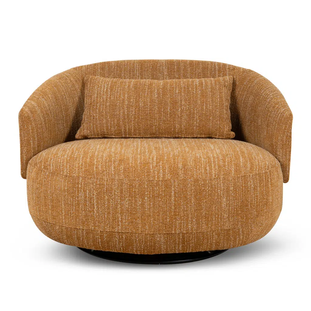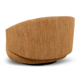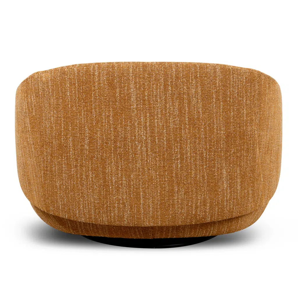 The circular seat paired with a curved backrest forms a timeless silhouette that complements any interior style. Rich ginger-brown polyester upholstery adds warm sophistication while maintaining easy-to-clean practicality for modern lifestyles.