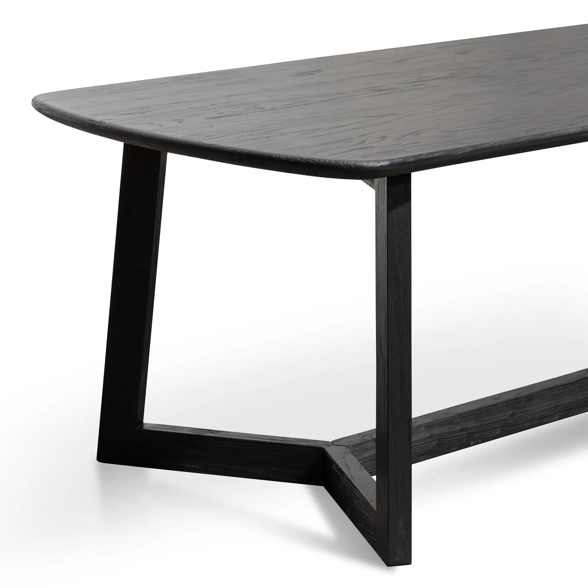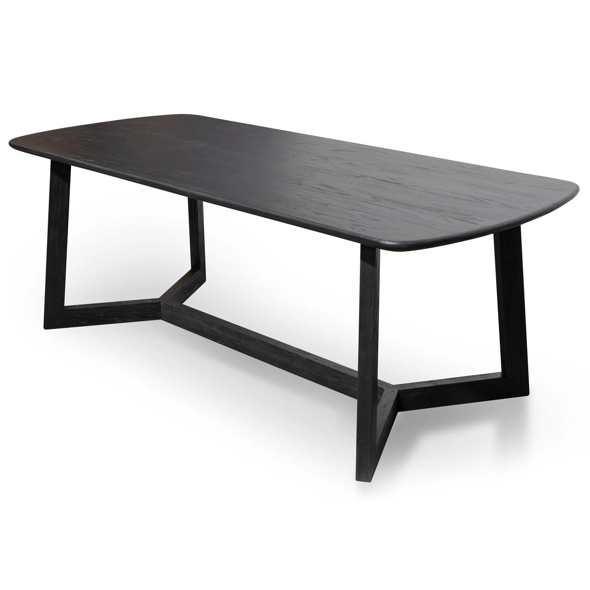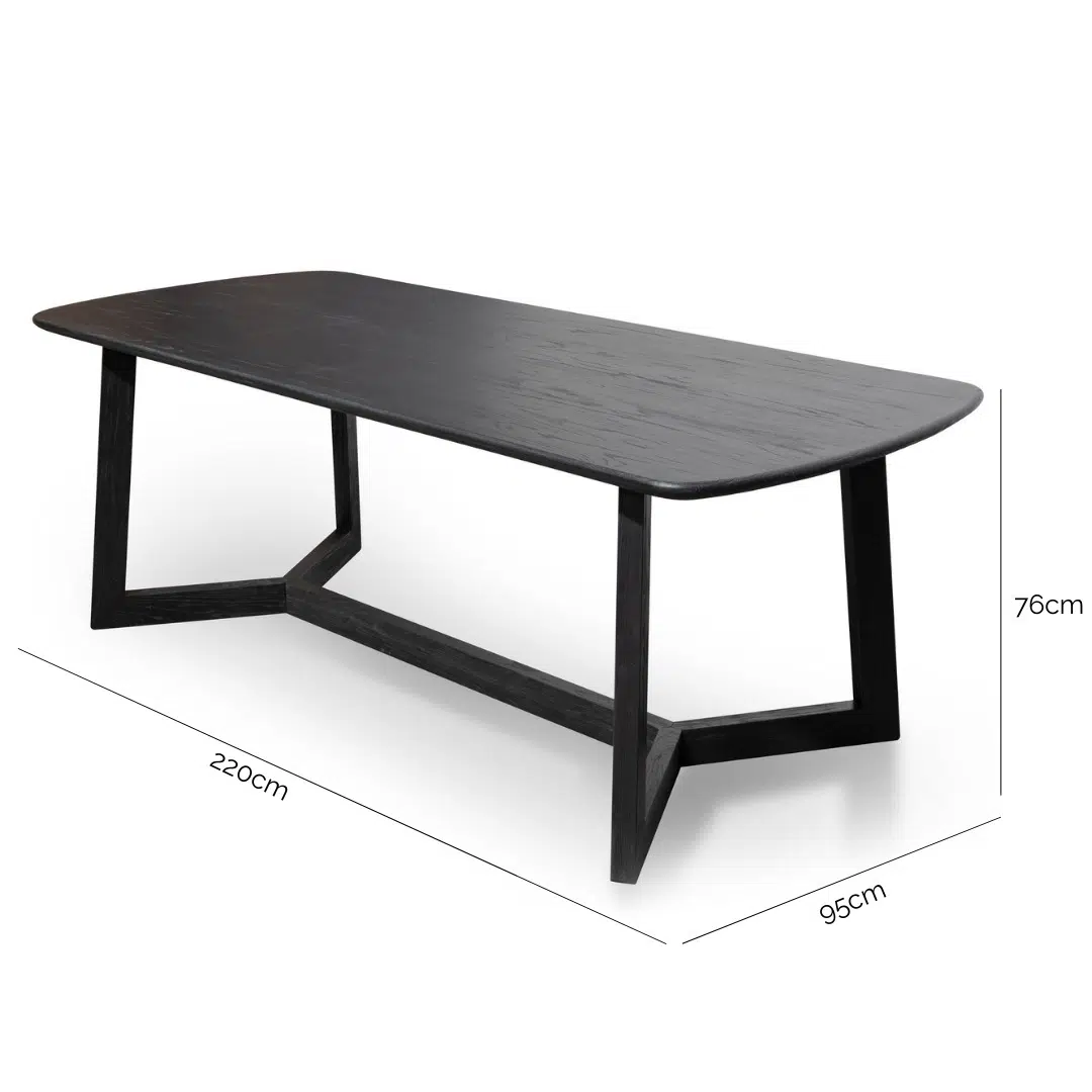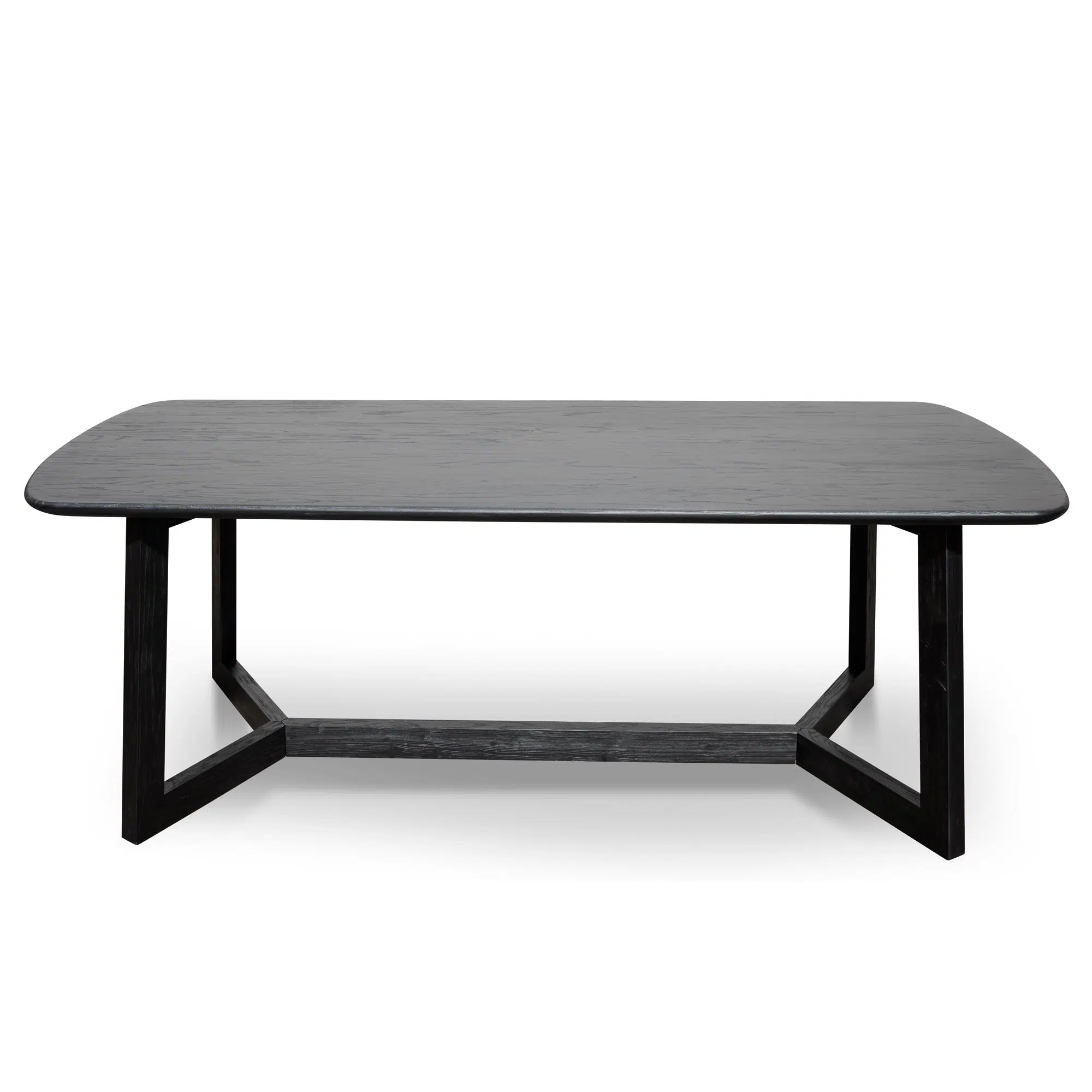 This 2.2-meter long dining table in a striking black finish combines contemporary aesthetics with organic warmth. The elm veneer tabletop showcases intricate wood grain patterns that add depth and visual interest, while the solid elm frame reinforces its modern minimalist design. Its sleek profile and neutral color make it a versatile focal point for both urban apartments and traditional homes.