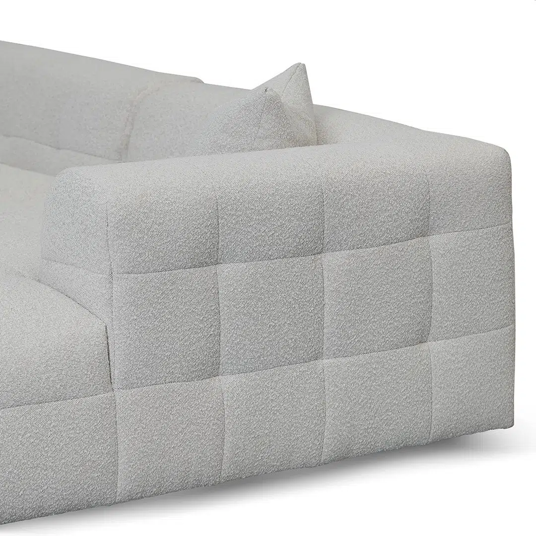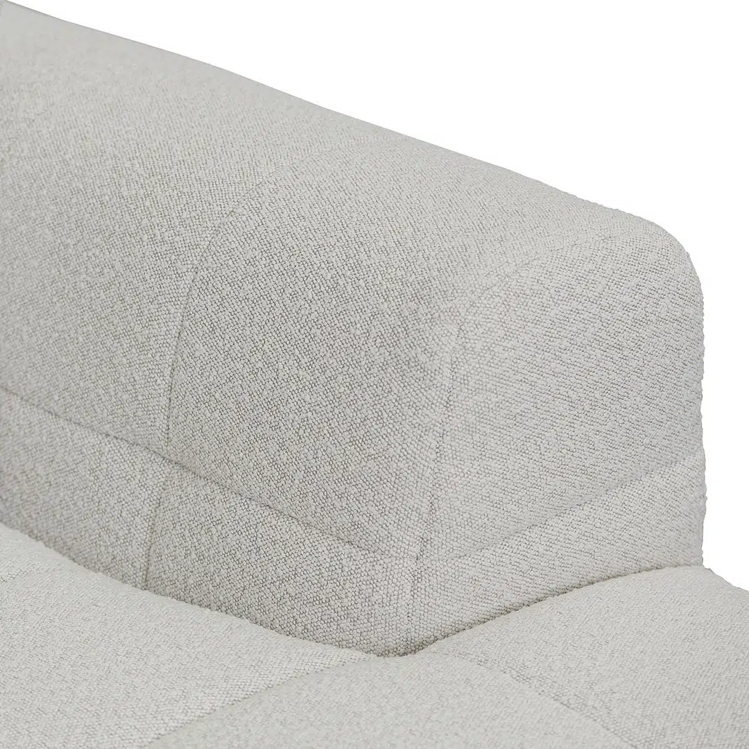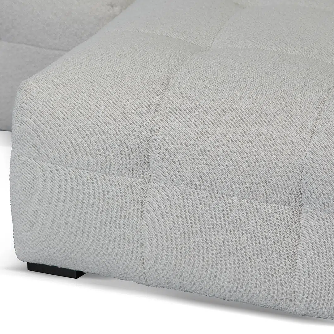 Mirella right chaise sofa in pearl boucle fabric with modern square arms and adjustable depth