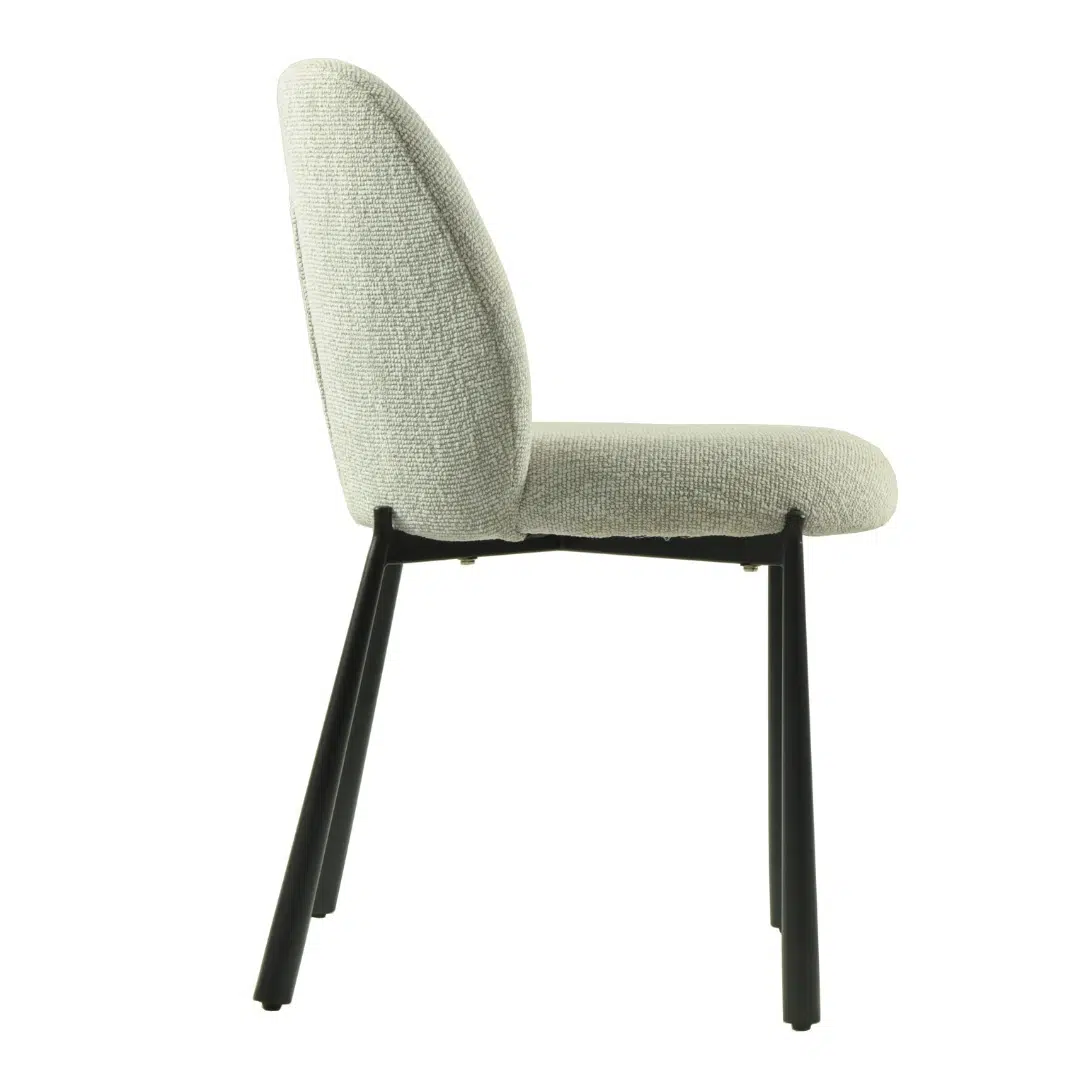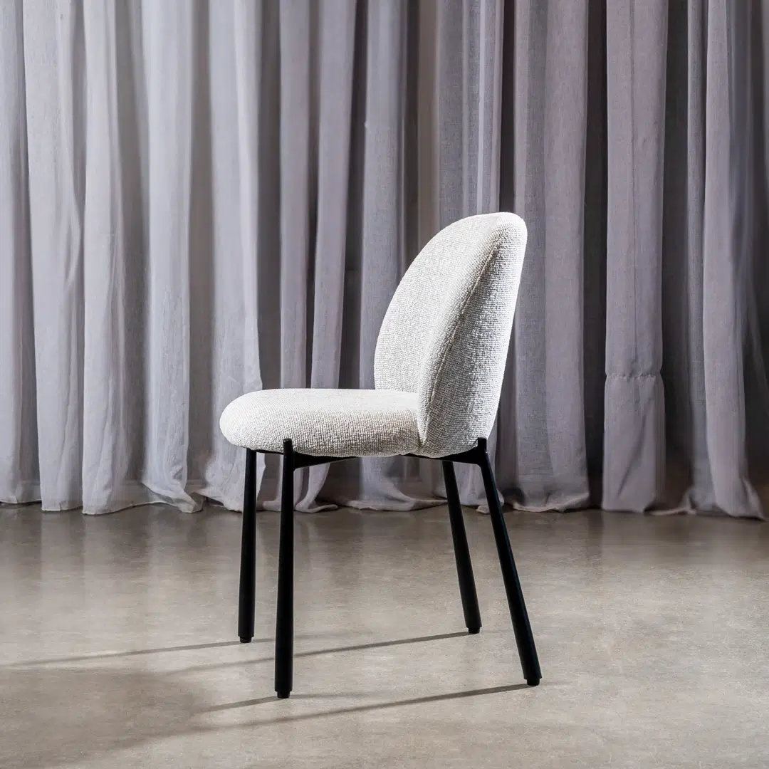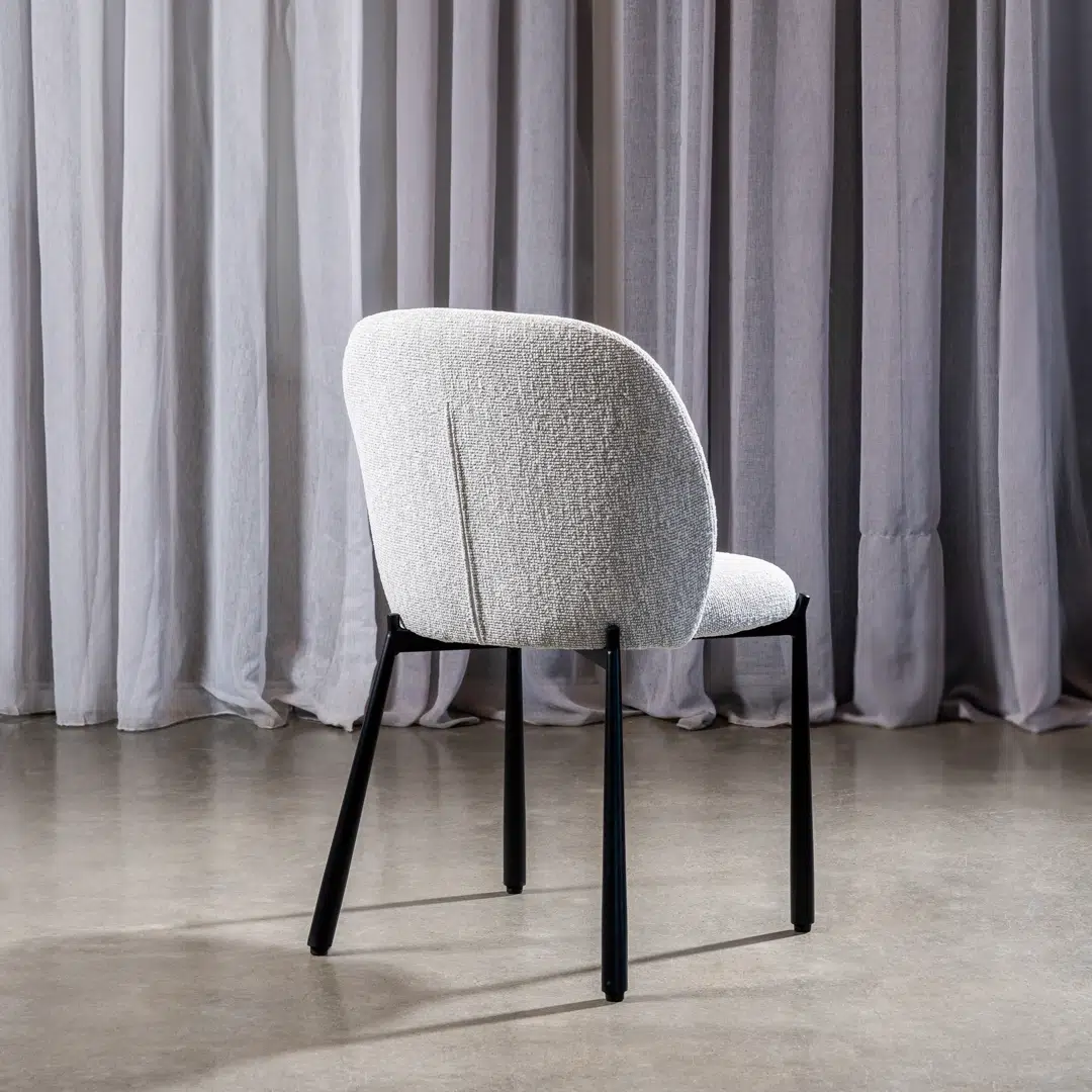 Upholstered in durable oyster-white boucle, the chair’s textured finish adds warmth and visual depth. The black powder-coated metal frame ensures strength and a sleek modern contrast.