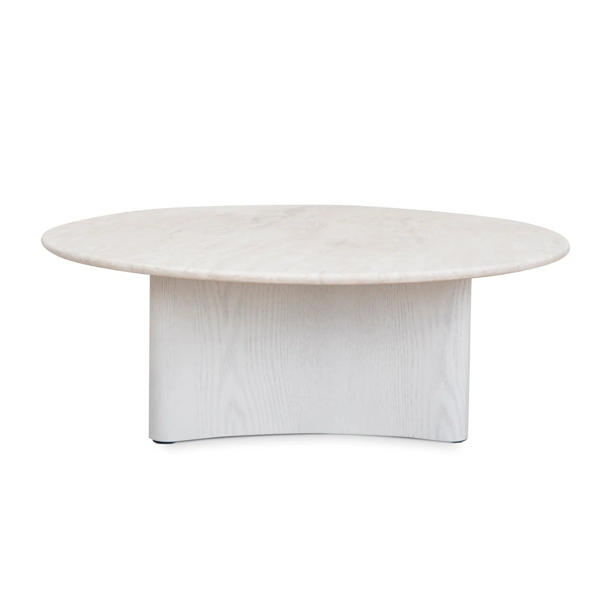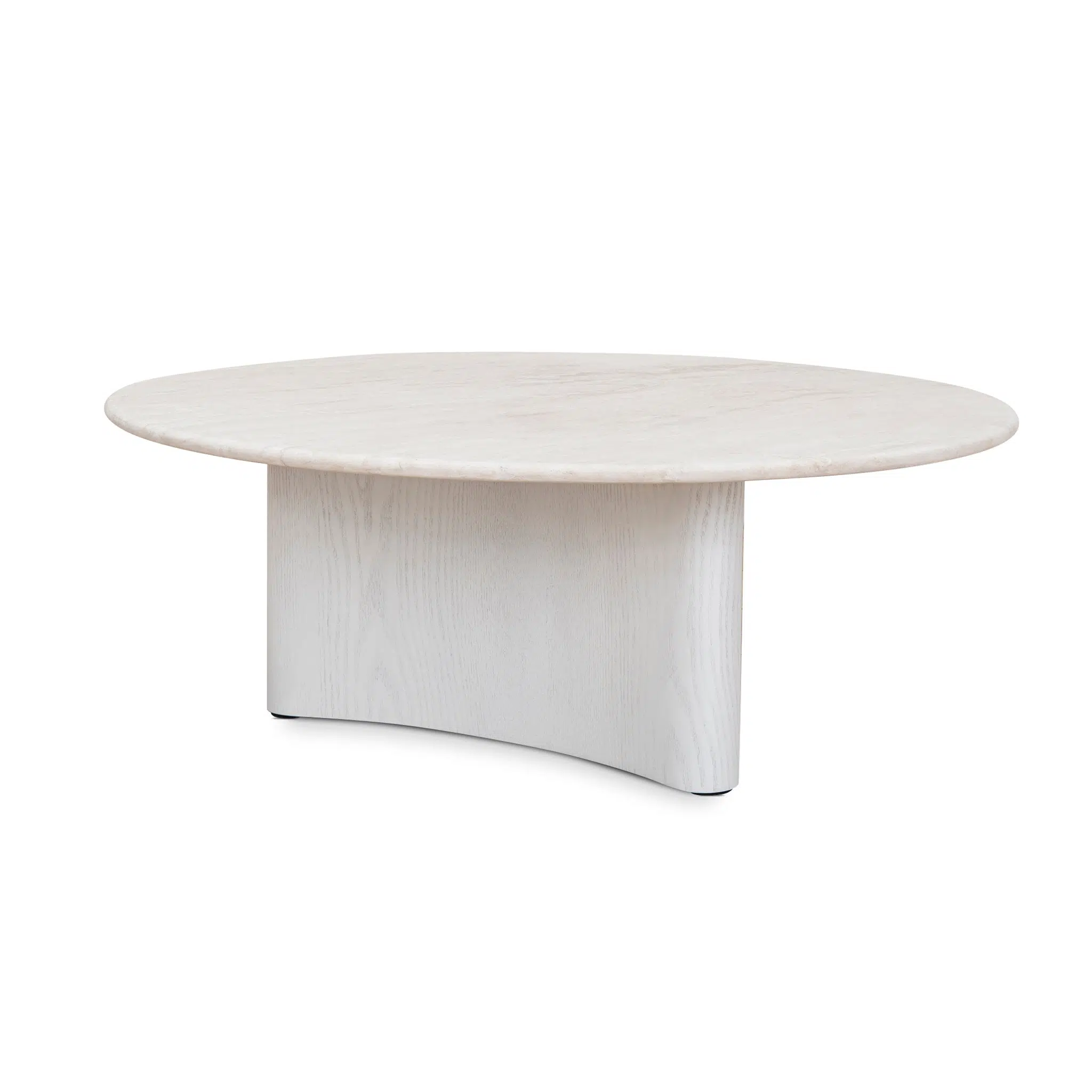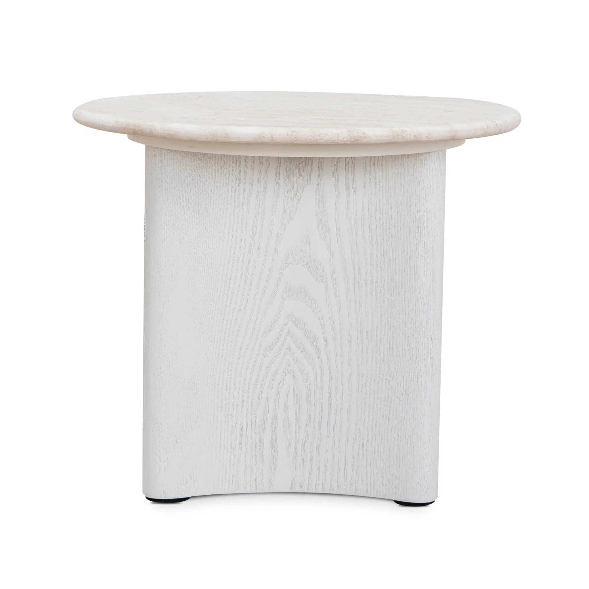 This piece features a natural travertine tabletop that showcases unique mineral patterns and subtle texture variations inherent to the material. The engineered wood base incorporates ash mountain grain veneer for rich visual depth, with smooth rounded edges ensuring safety for high-traffic areas. The curved wooden base design (32.7cm wide) complements the stone surface while creating a floating visual effect through its 40.2cm height.